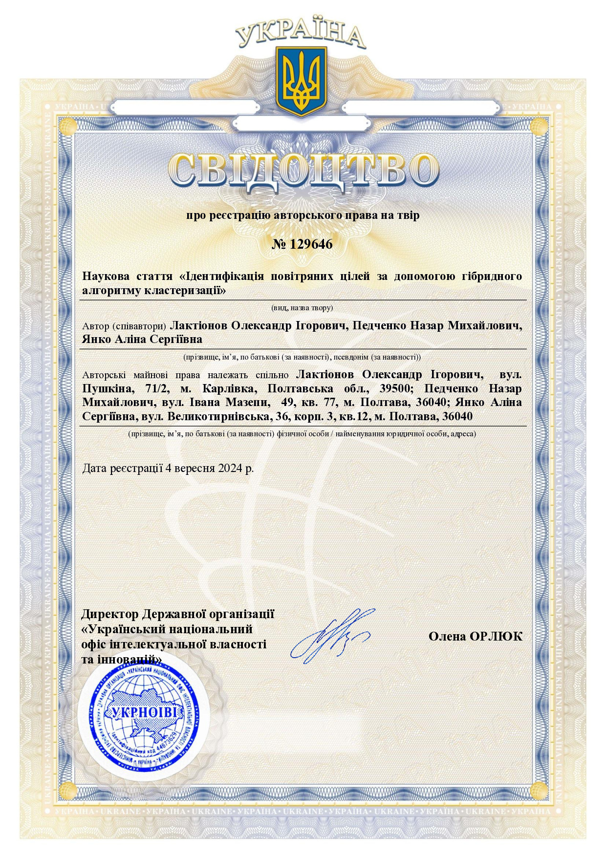 Свідоцтво про реєстрацію авторського права № 129646 на твір "Ідентифікація повітряних цілей за допомогою гібридного алгоритму кластеризації"