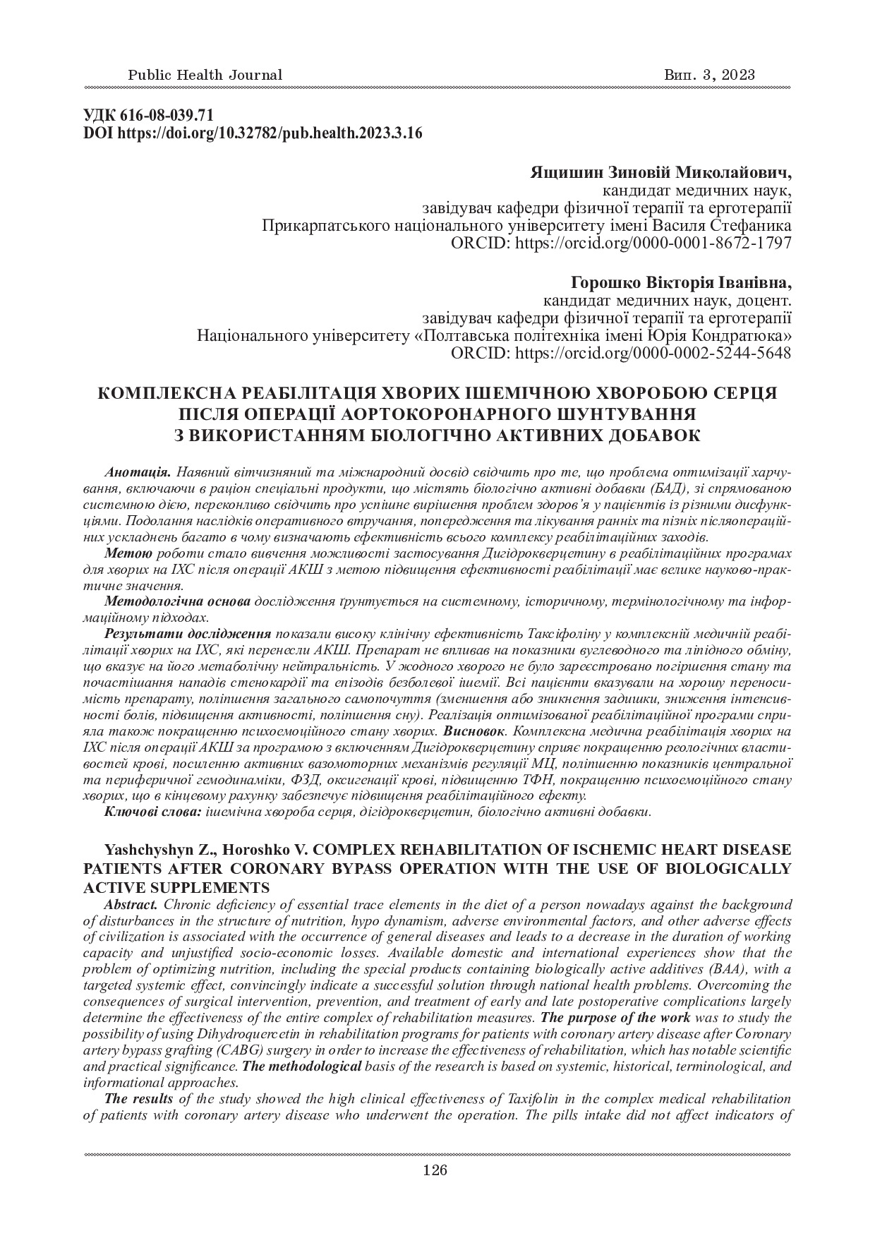 Комплексна реабілітація хворих ішемічною хворобою серця після операції аортокоронарного шунтування з використанням біологічно активних добавок