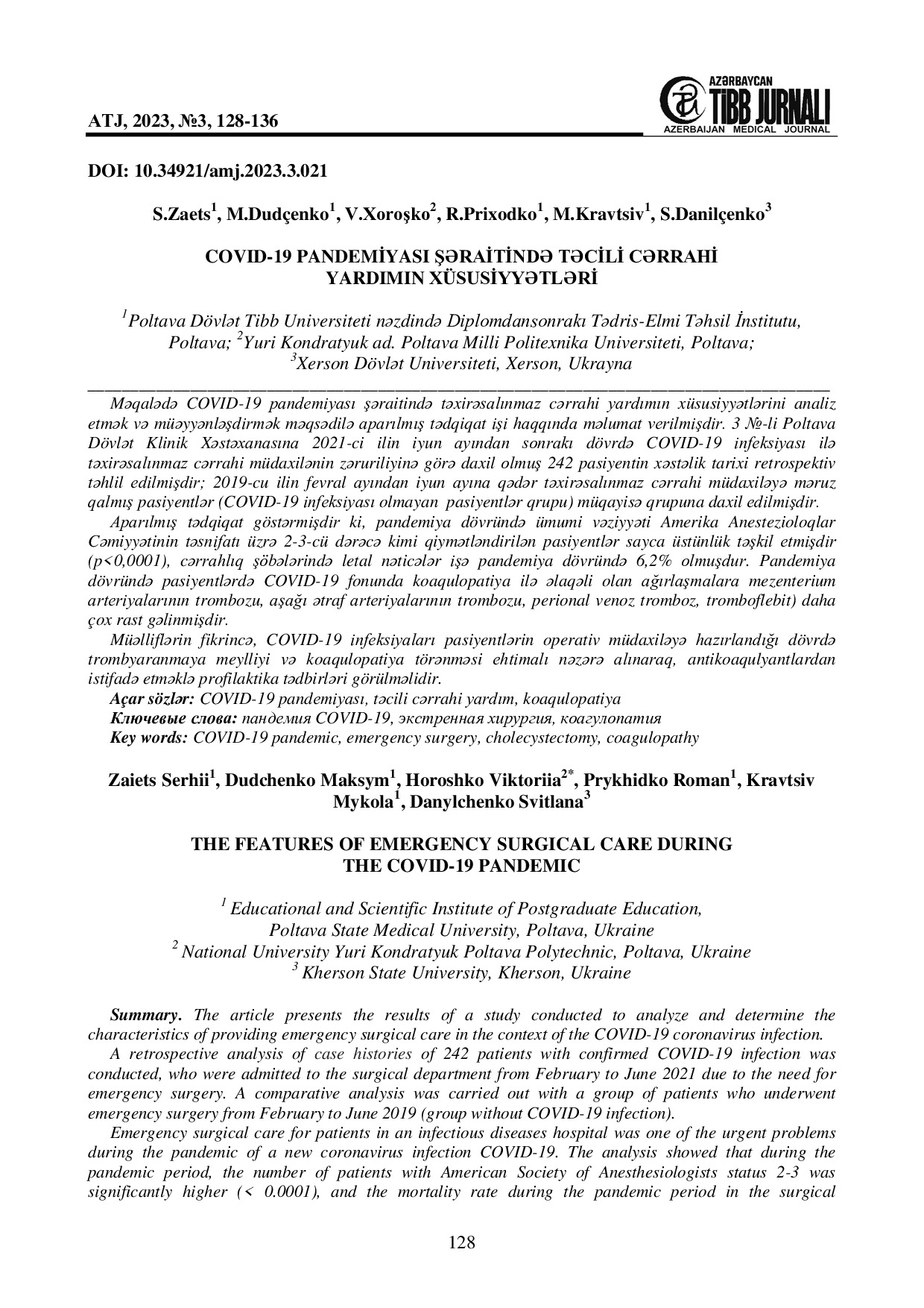 The features of emergency surgical care during the Covid-19 pandemic / S.M. Zaiets, M.O. Dudchenko, V.I. Horoshko, R.A. Prykhidko, M.I. Kravtsiv, S.I. Danylchenko // Azerbaijan medical journal. – 2023. – № 3. – P. 128–136. – DOI: 10.34921/amj.2023.3.021