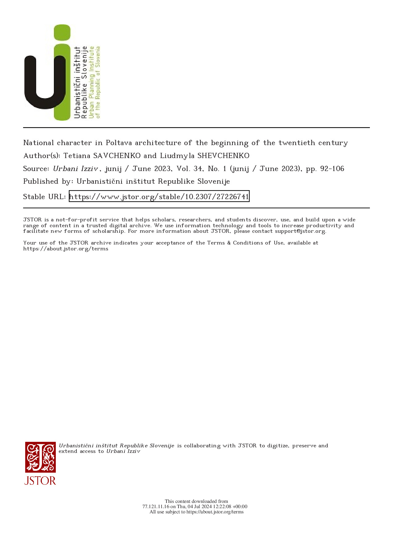 Savchenko T. National character in Poltava architecture of the beginning of the twentieth century / T. Savchenko, L. Shevchenko // URBANI IZZIV. –2023.– Vol. 34, no. 1. – P. 92 – 106.