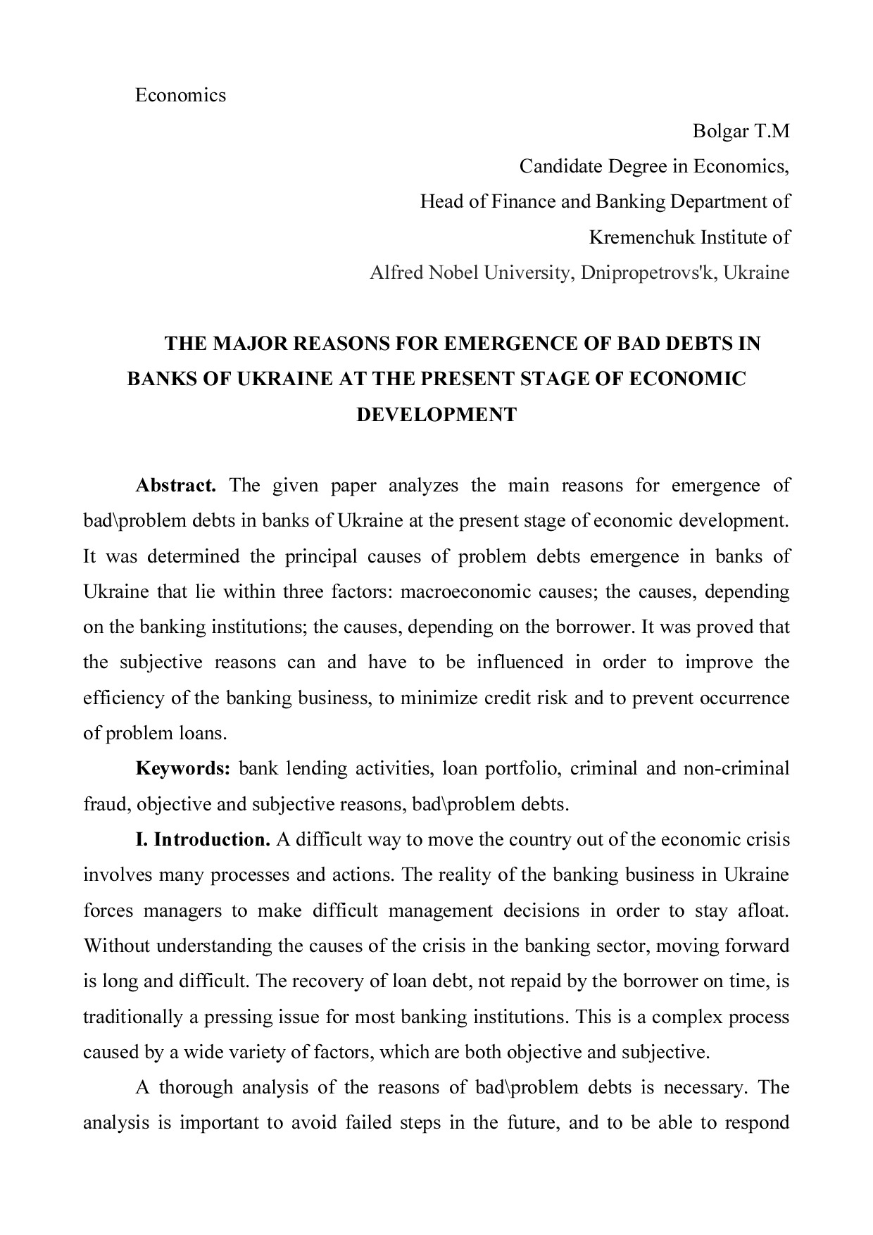 The major reasons for emergence of bad debts in banks of Ukraine at the present stage of economic development
