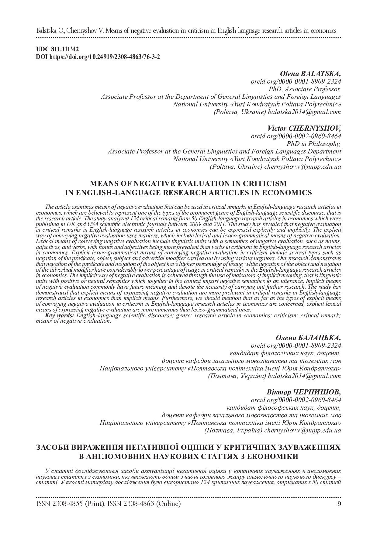Balatska О.L. Means of negative evaluation in criticism in english-language research articles in economics / О.L. Balatska, V.V. Chernyshov // Актуальнi питання гуманiтарних наук : міжвуз. зб. наук. пр. молодих вчених Дрогоб. держ. пед. ун-ту ім. Івана Франка. – Дрогобич : Гельветика, 2024. – Вип. 76. Т. 3. – С. 9 – 13. – DOI https://doi.org/10.24919/2308-4863/76-3-2