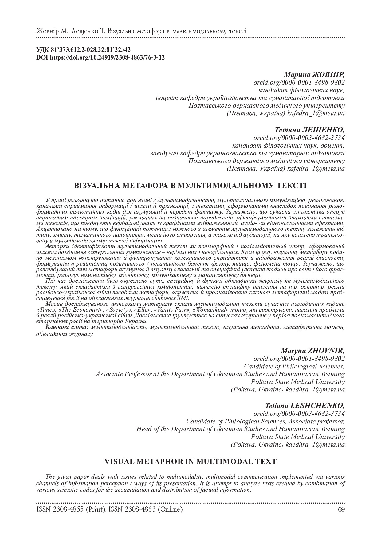 У праці розглянуто питання, пов’язані з мультимодальністю, мультимодальною комунікацією, реалізованою каналами сприймання інформації / шляхи її трансляції, і текстами, сформованими внаслідок поєднання різно- форматних семіотичних кодів для акумуляції й передачі фактажу. Зауважено, що сучасна лінгвістика оперує строкатим спектром номінацій, уживаних на позначення породжених різноформатними знаковими система- ми текстів, що поєднують вербальні знаки із графічними зображеннями, аудіо- чи відеовізуальними ефектами. Акцентовано на тому, що функційний потенціал кожного з елементів мультимодального тексту залежить від типу, змісту, тематичного наповнення, мети його створення, а також від аудиторії, на яку націлено трансльо- вану в мультимодальному тексті інформацію. Авторки ідентифікують мультимодальний текст як поліморфний і полісеміотичний утвір, сформований шляхом поєднання гетерогенних компонентів – вербальних і невербальних. Крім цього, візуальну метафору пода- но механізмом конструювання й функціонування колективного сприйняття й відображення реалій дійсності, формування в реципієнта позитивного / негативного бачення факту, явища, феномена тощо. Зауважено, що розглядуваний тип метафори акумулює й візуалізує загальні та специфічні уявлення людини про світ і його фраг- менти, реалізує номінативну, когнітивну, комунікативну й маніпулятивну функції.