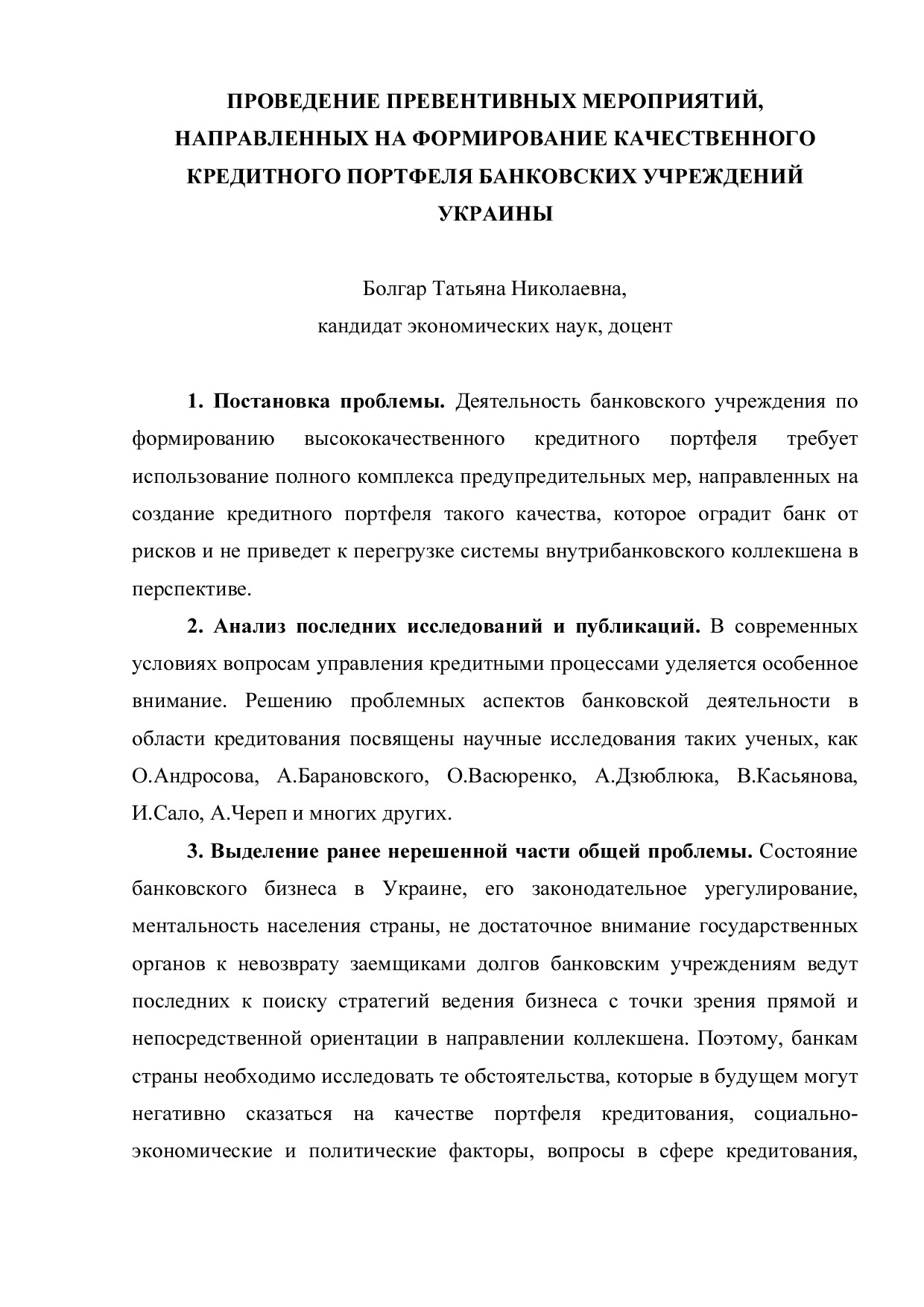 Проведение превентивных мероприятий, направленных на формирование качественного кредитного портфеля банковских учреждений Украины