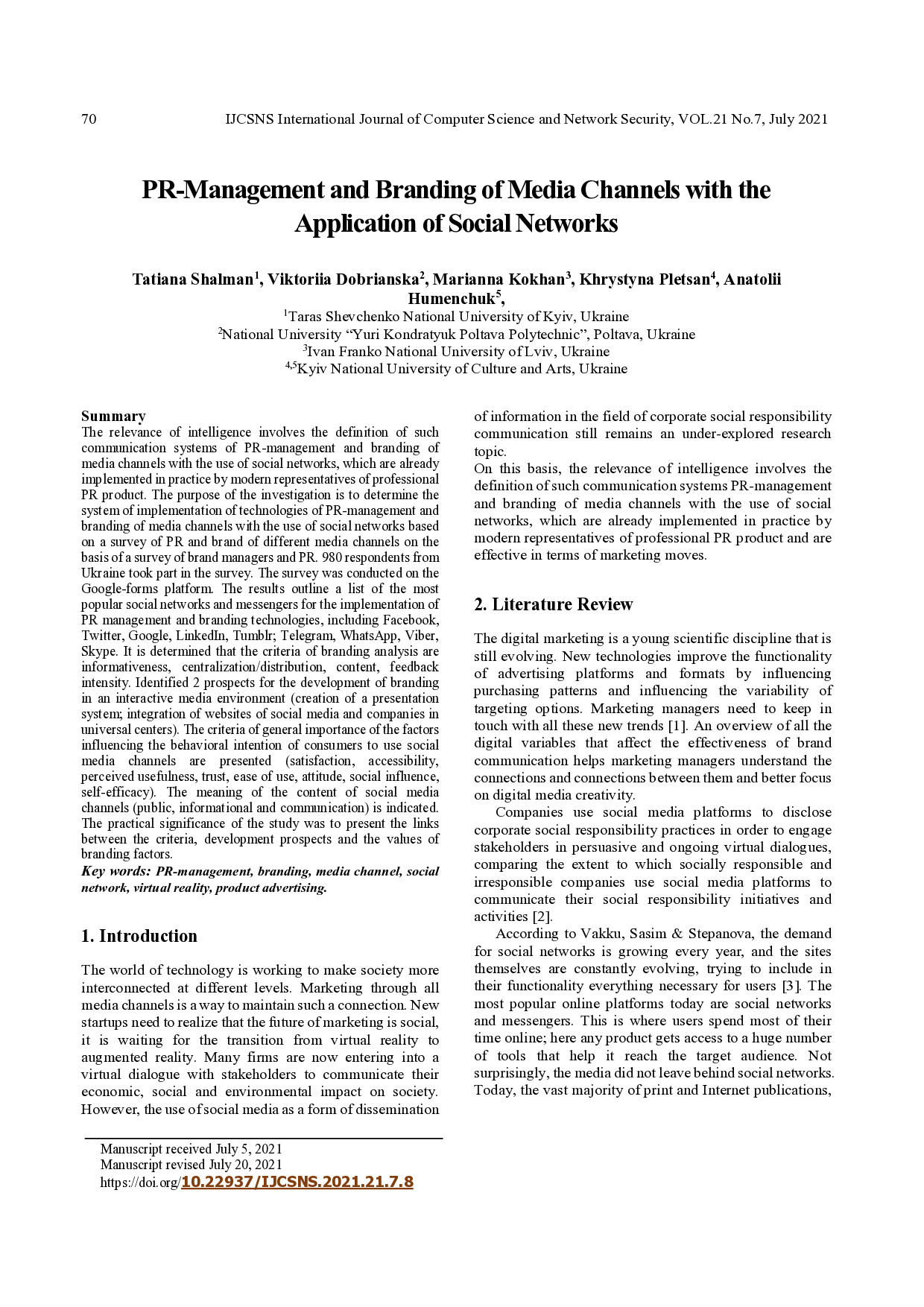 PR-Management and Branding of Media Channels with the Application of Social Networks / T. Shalman, V. Dobrianska, M. Kokhan et al. // IJCSNS International Journal of Computer Science and Network Security. – 2021. – Vol. 21, No. 7. – URL : http://paper.ijcsns.org/07\_book/202107/20210708.pdf.