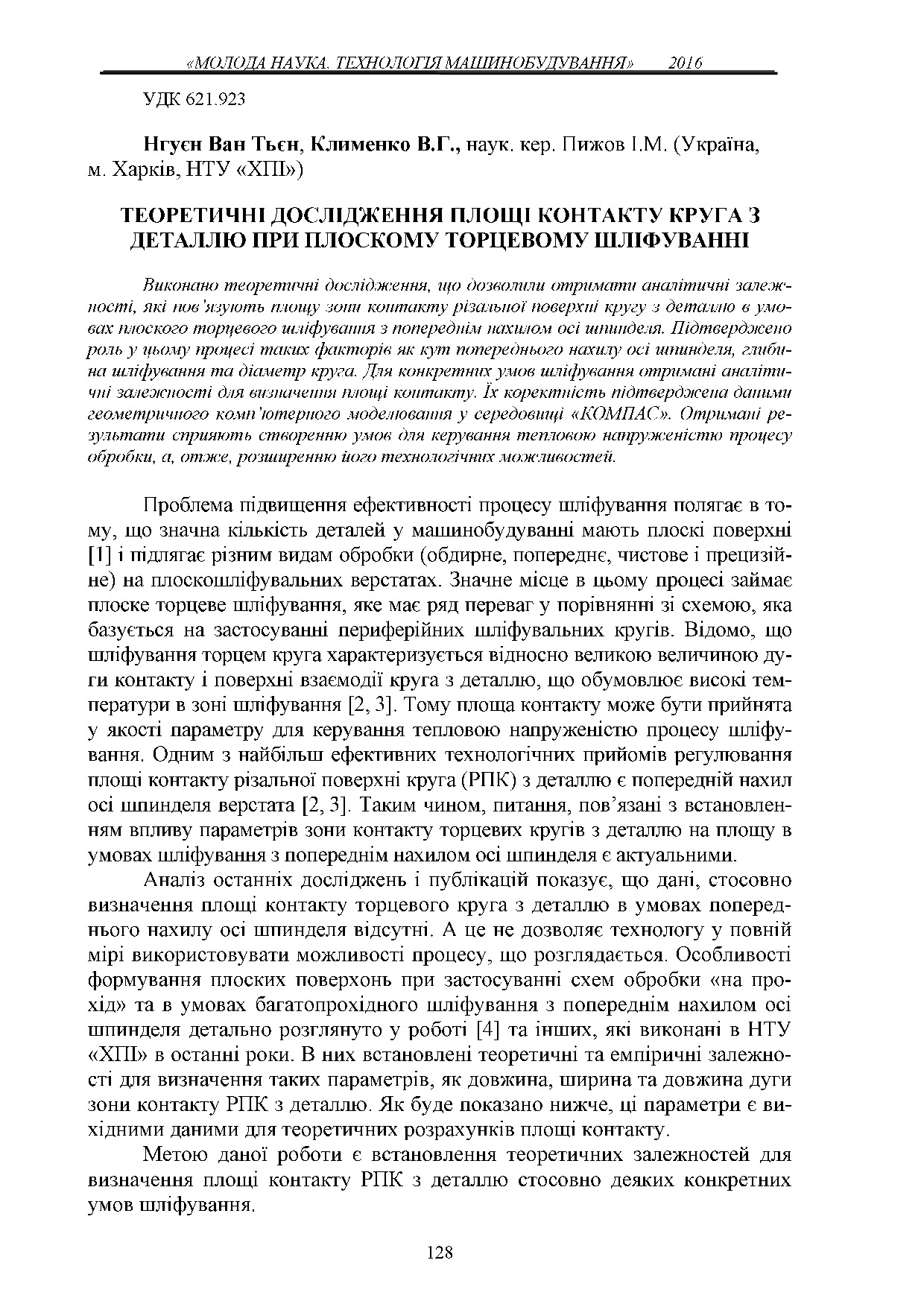 Теоретичні дослідження площі контакту круга з деталлю при плоскому торцевому шліфуванні