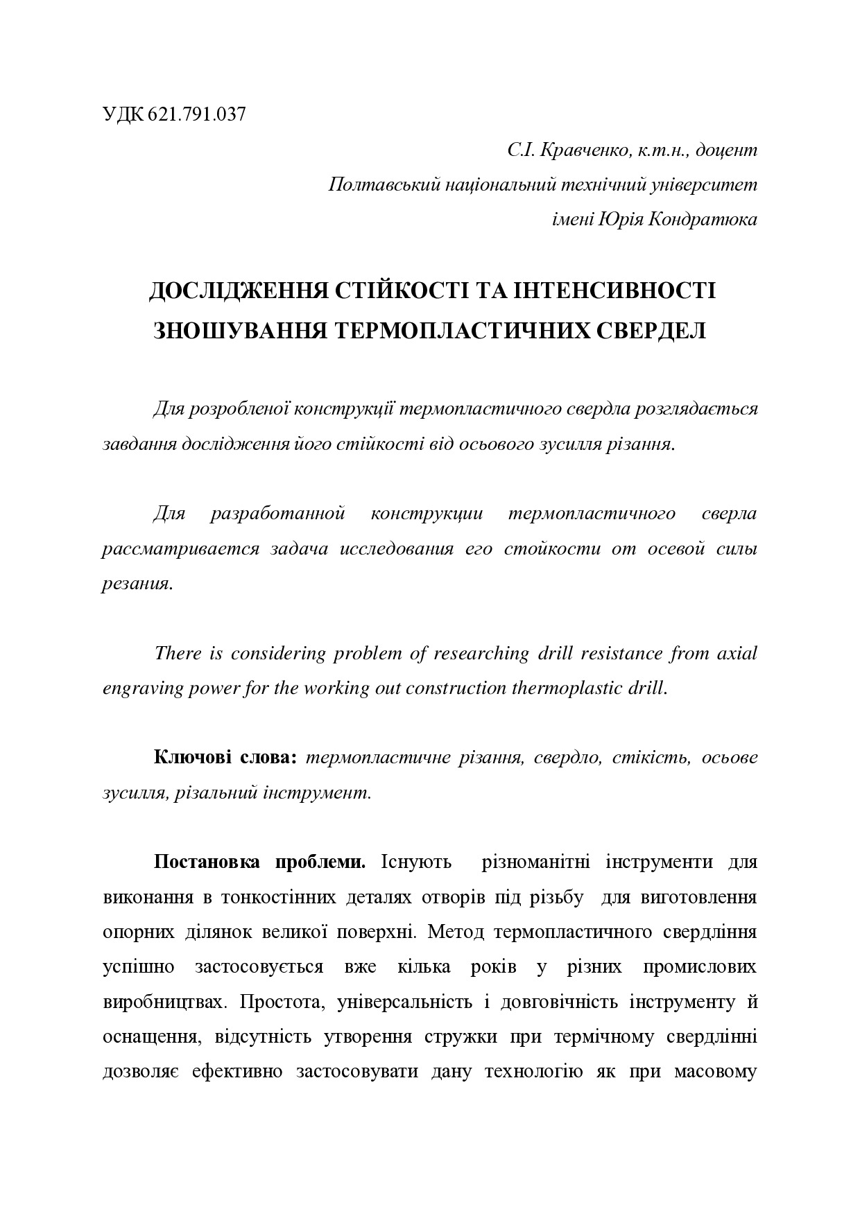 Дослідження стійкості та інтенсивності зношування термопластичних свердел
