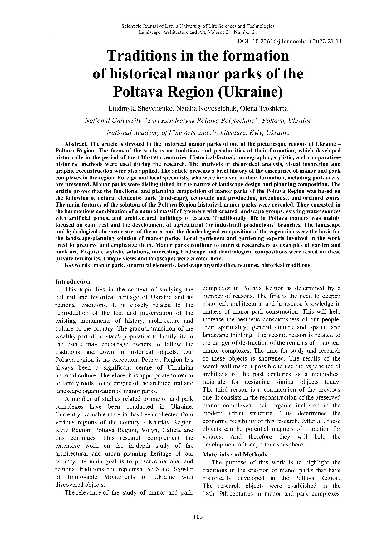 Shevchenko L. Traditions in the formation of historical manor parks of the Poltava Region (Ukraine) / Liudmyla Shevchenko, Natalia Novoselchuk, Olena Troshkina // Landscape Architecture and Art. – 2022. – Vol. 21, No. 21. – P. 105-114. – DOI: 10.22616/j.landarchart.2022.21.11