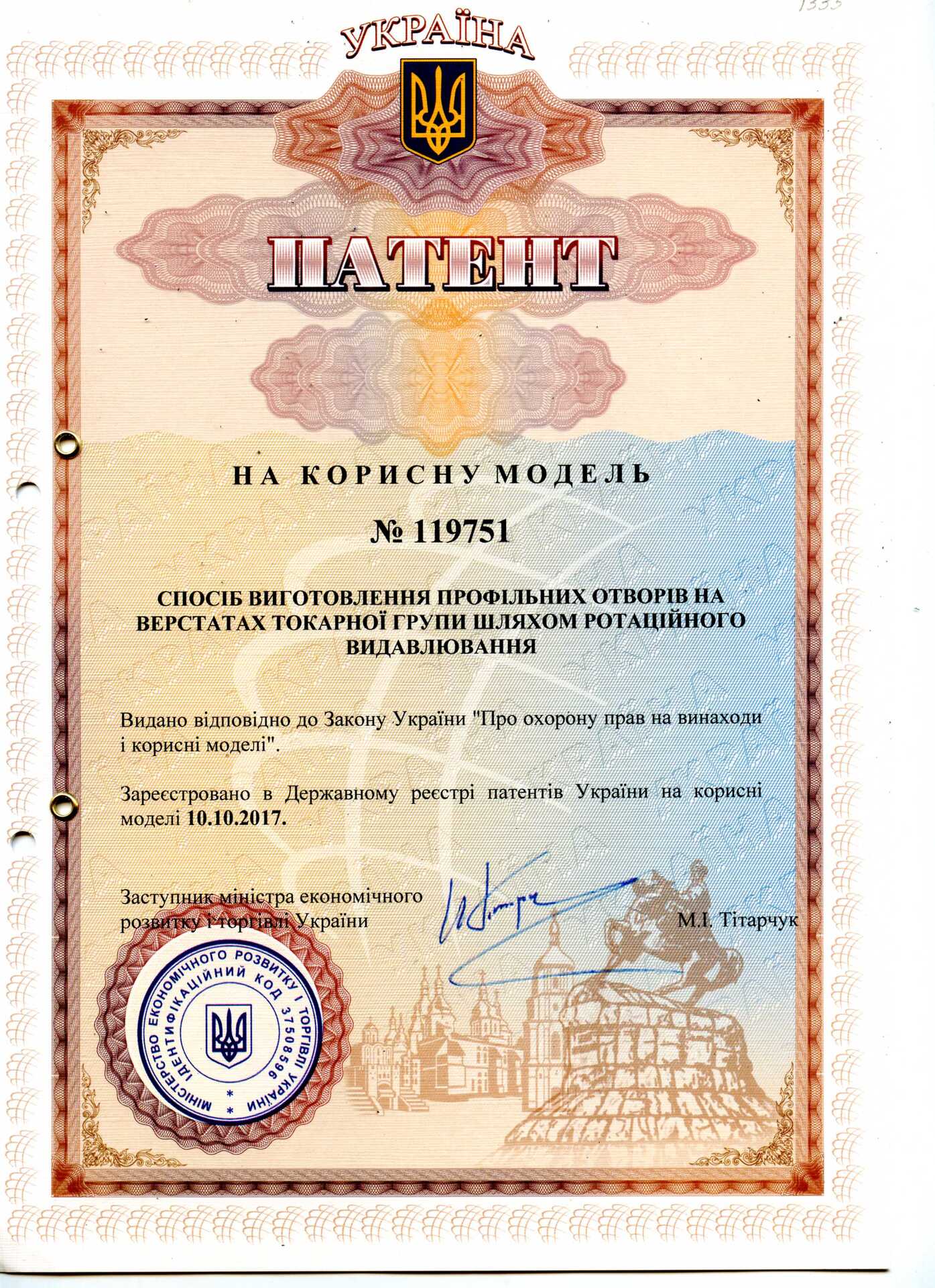 Спосіб виготовлення профільних отворів на верстатах токарної групи шляхом ротаційного видавлювання : пат. № 119751