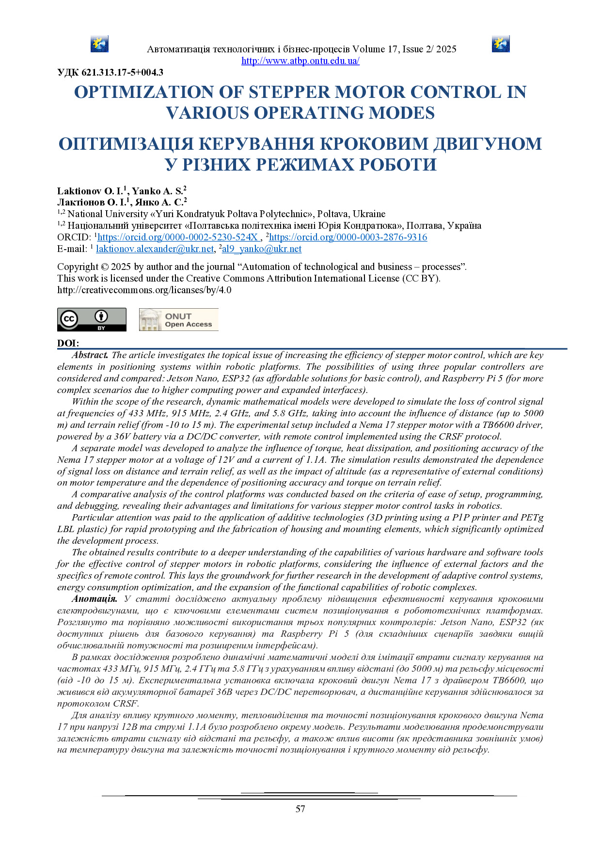Laktionov O.I. Optimization of stepper motor control in various operating modes / O.I. Laktionov, A.S.Yanko // Automation of technological and business processes. – 2025. – Vol. 17, Iss. 2. – P. 57-63. – DOI https://doi.org/10.15673/atbp.v17i2.3151