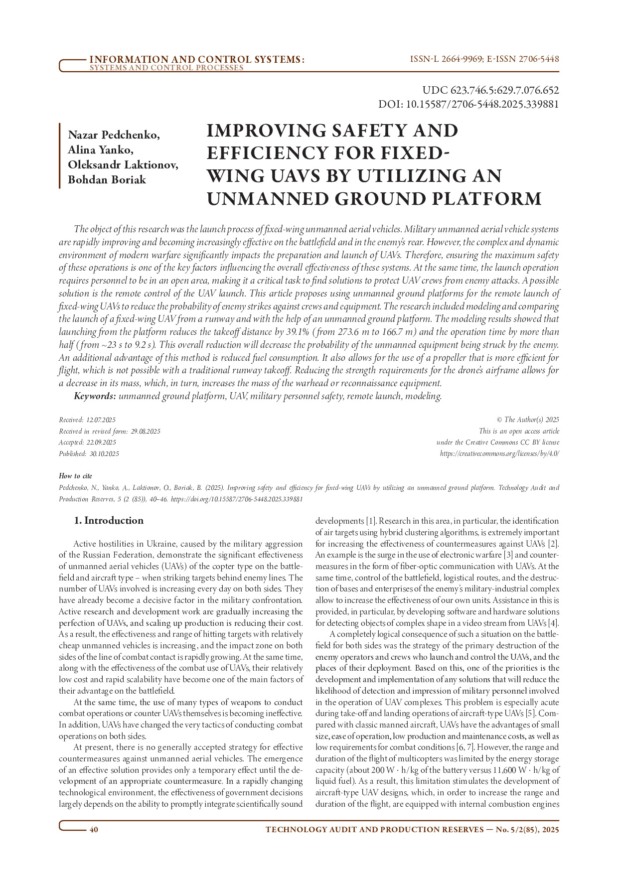 Improving safety and efficiency for fixed-wing UAVs by utilizing an unmanned ground platform / N. Pedchenko, A. Yanko, O. Laktionov, B. Boriak // Technology Audit and Production Reserves. – 2025. – Vol. 5, №2 (85). – P. 40–46. – DOI: https://doi.org/10.15587/2706-5448.2025.339881