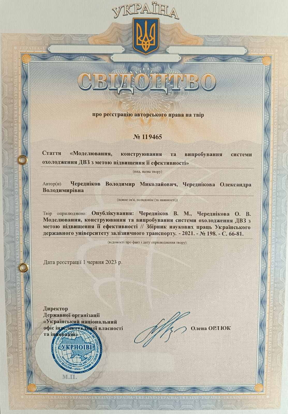 Свідоцтво про реєстрацію авторського права № 119465 на твір «Моделювання, конструювання та випробування системи охолодження ДВЗ з метою підвищення її ефективності»