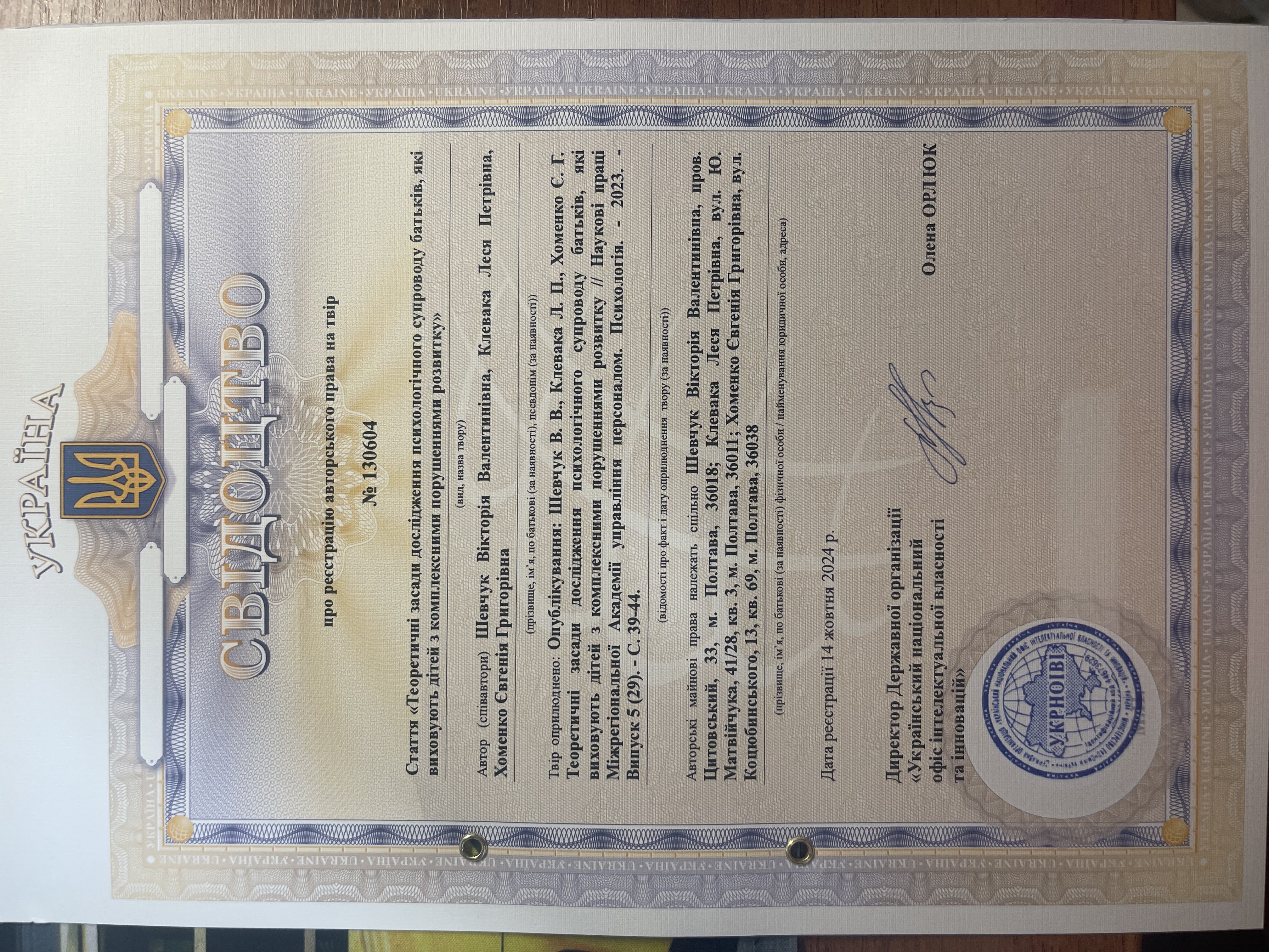 Свідоцтво про реєстрацію авторського права № 130604 на твір «Теоретичні засади дослідження психологічного супроводу батьків, які виховують дітей з комплексними порушеннями розвитку»