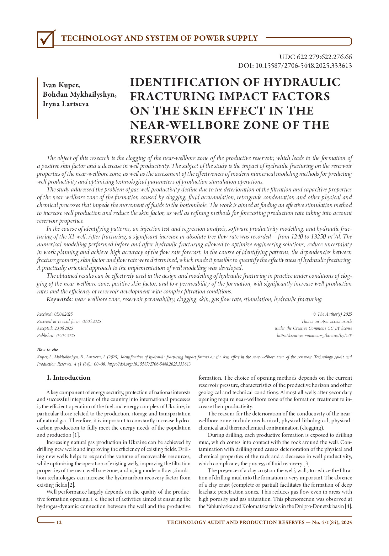 Kuper I. Identification of hydraulic fracturing impact factors on the skin effect in the near-wellbore zone of the reservoir / I. Kuper, B. Mykhailyshyn, I. Lartseva // Technology Audit and Production Reserves. – 2025. – Vol. 4, Iss. 1 (84). – P. 40–49. – https://doi.org/10.15587/2706-5448.2025.333613