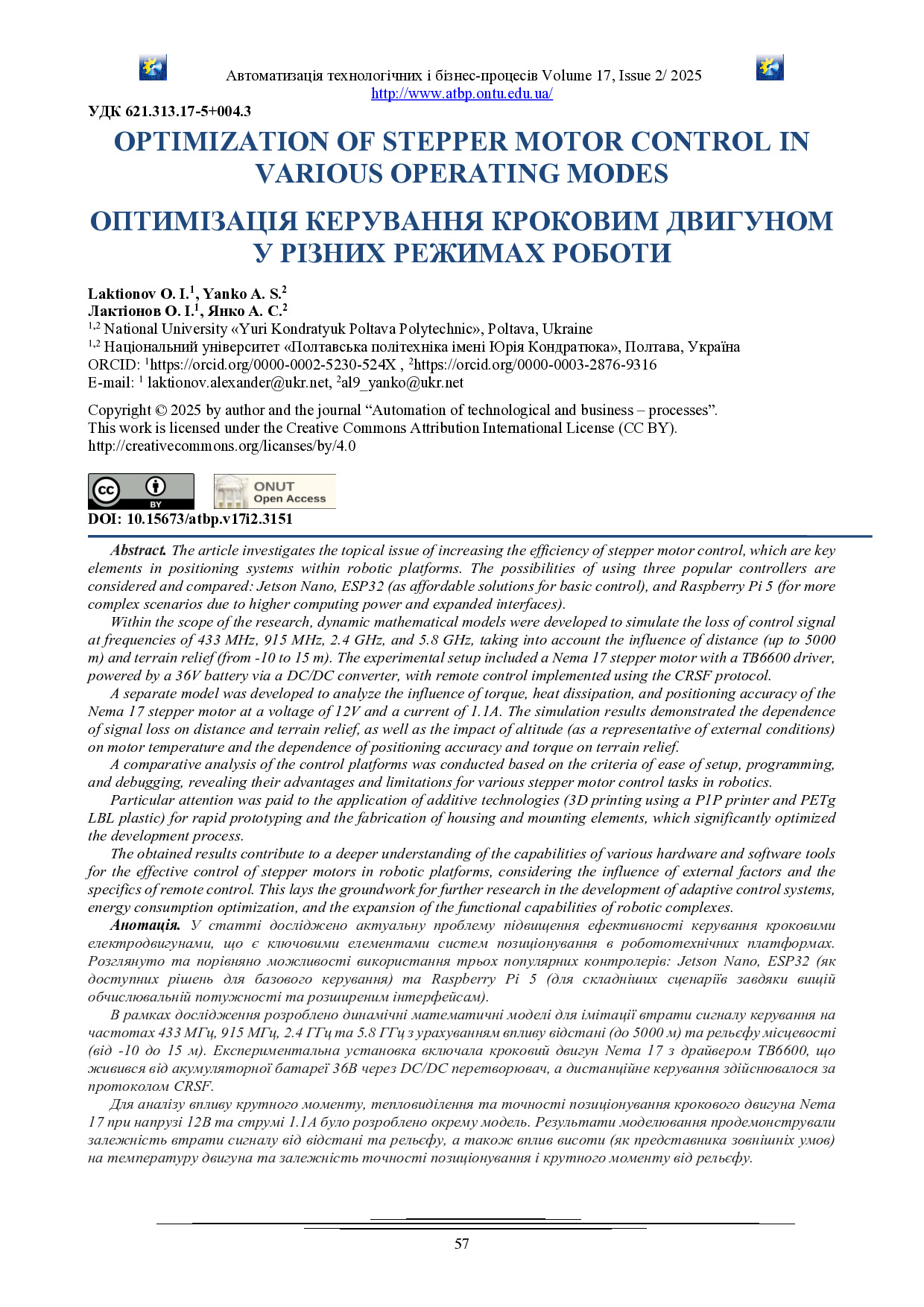 Laktionov O.I. Optimization of stepper motor control in various operating modes / O.I. Laktionov, A.S.Yanko // Автоматизація технологічних і бізнес-процесів. – 2025. – Vol. 17, Iss. 2. – P. 57-63. – DOI https://doi.org/10.15673/atbp.v17i2.3151