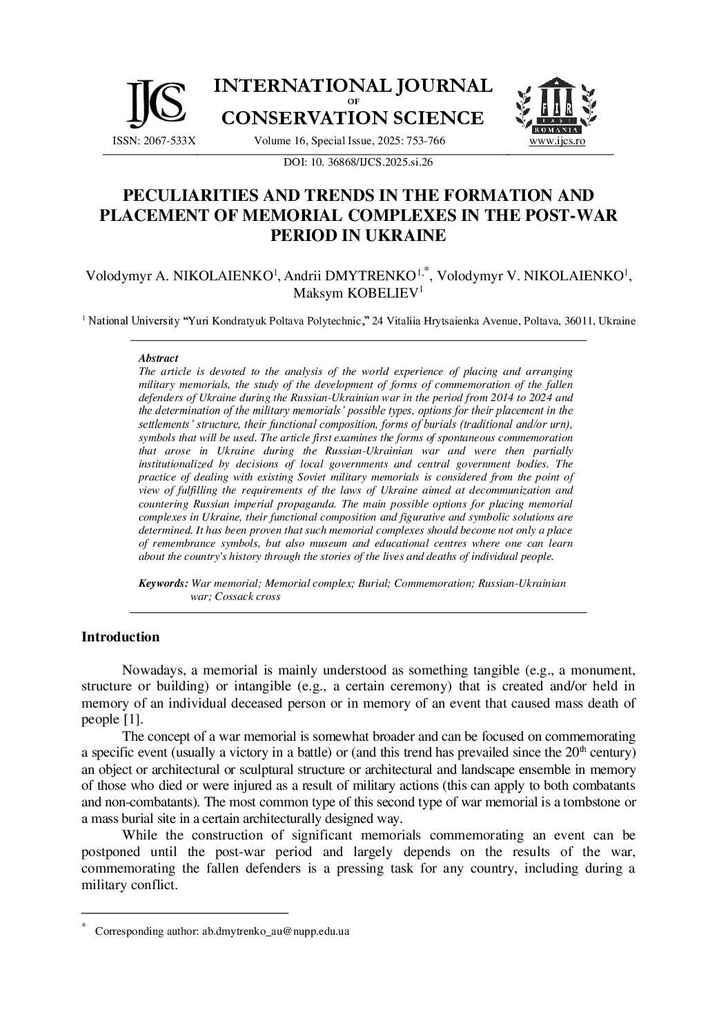 Peculiarities and Trends in the Formation and Placement of Memorial Complexes in the Post-War Period in Ukraine / V.A. Nikolaienko, A.Yu. Dmytrenko, V.V. Nikolaienko, M. Kobeliev // International Journal of Conservation Science. – 2025. – Vol. 16, Spec. Iss. – P. 753–766. – DOI: 10.36868/IJCS.2025.si.26