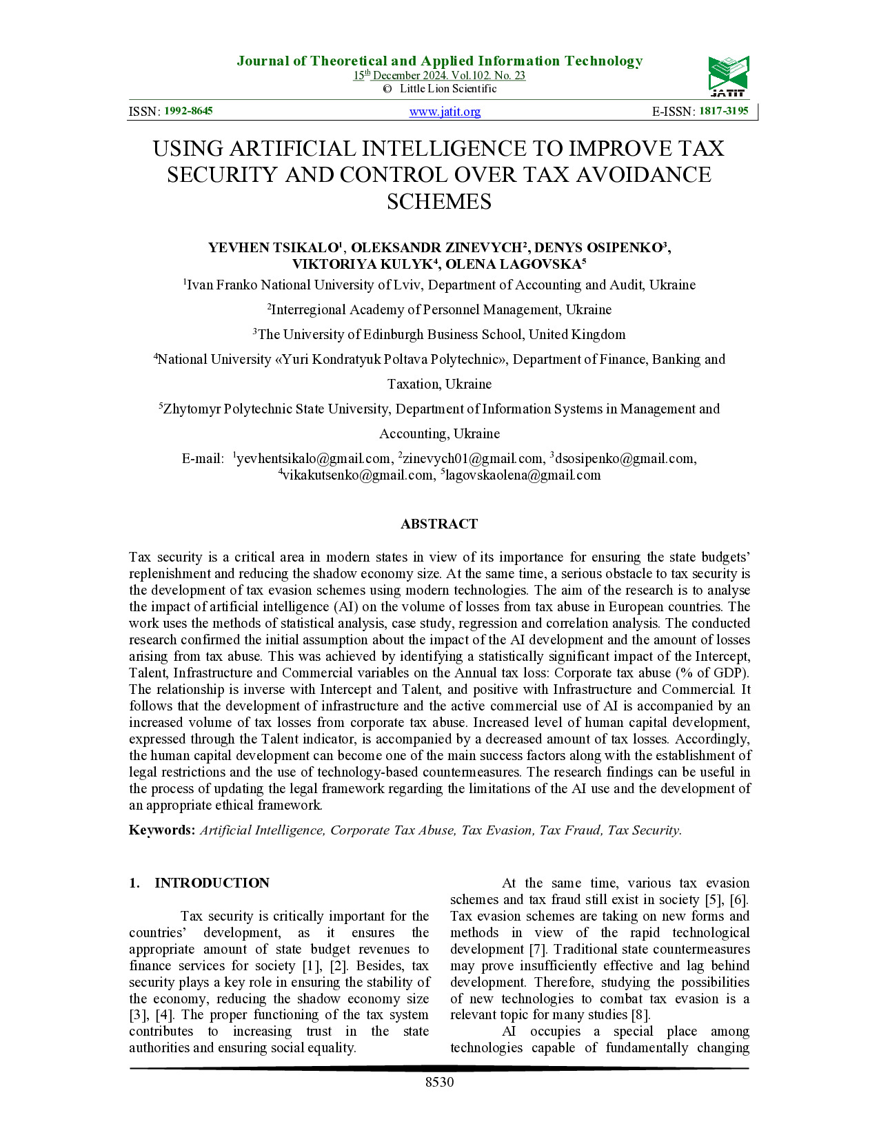 Using Artificial Intelligence to Improve Tax Security and Control over Tax Avoidance Schemes / Ye. Tsikalo, O. Zinevych, D. Osipenko, V. Kulyk, O. Lagovska // Journal of Theoretical and Applied Information Technology. – 2024. – Vol. 102, № 23. – Р. 8530-8542. – URL : https://www.jatit.org/volumes/Vol102No23/9Vol102No23.pdf