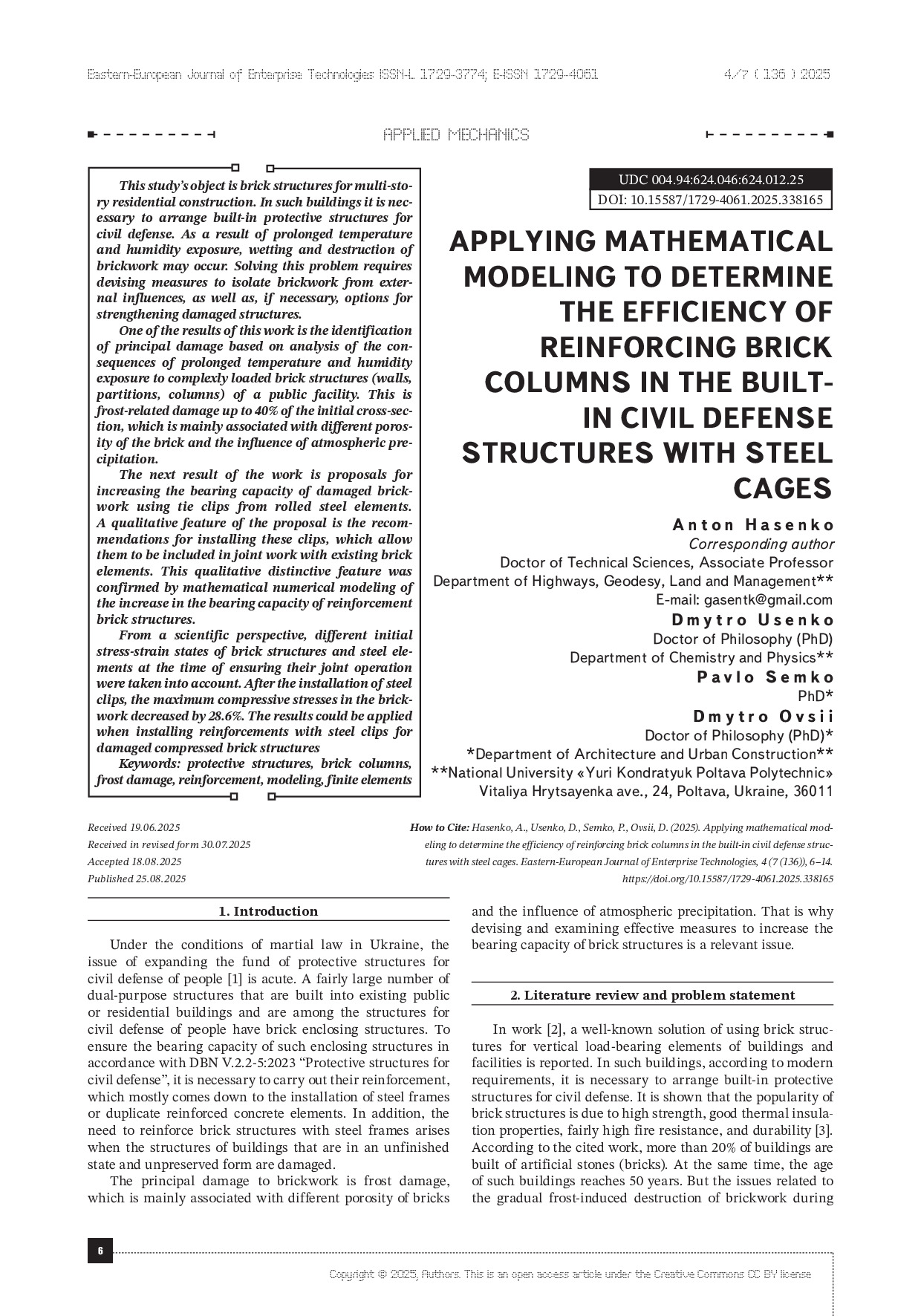 Applying mathematical modeling to determine the efficiency of reinforcing brick columns in the built-in civil defense structures with steel cages