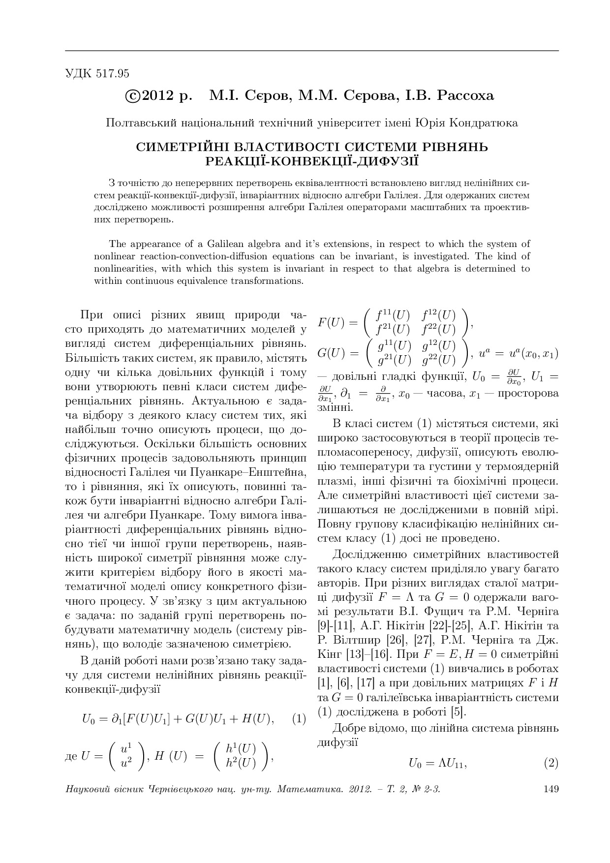 Симетрійні властивості системи рівнянь реакції-конвекції-дифузіїЇ