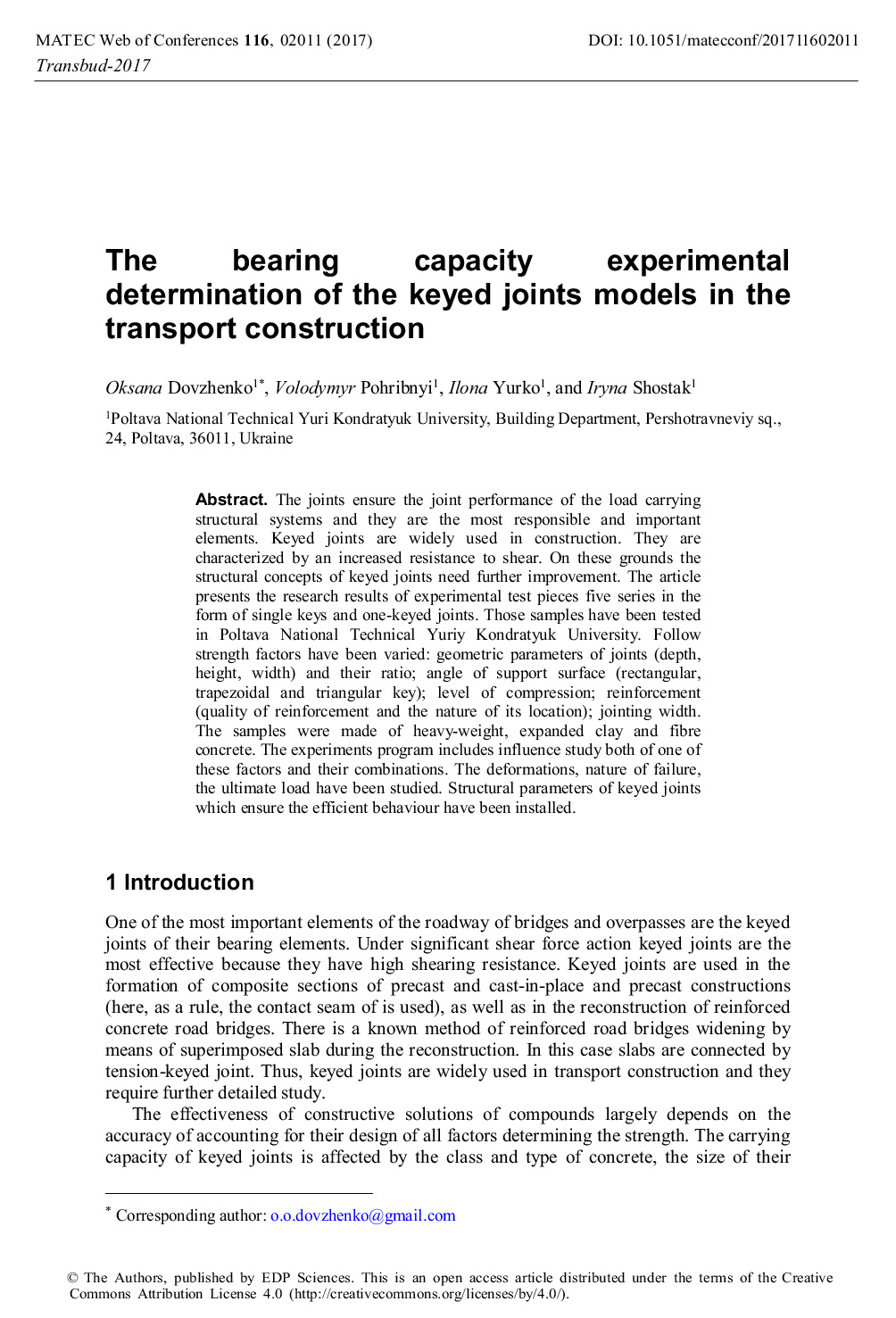 The bearing capacity experimental determination of the keyed joints models in the transport construction