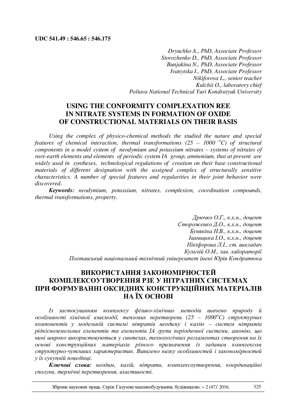 Dryuchko A. Using the conformity complexation REE in nitrate systems in formationof oxide of costructional materials on their basis / A. Dryuchko, D. Storozhenko, N. Bunjakina, I. Ivanytska, L. Nikiforova, O. Kulchii // Збірник наукових праць. Серія: Галузеве машинобудування, будівництво. – Полтава : ПолтНТУ, 2016. – Вип. 2(47). – С. 325-335.