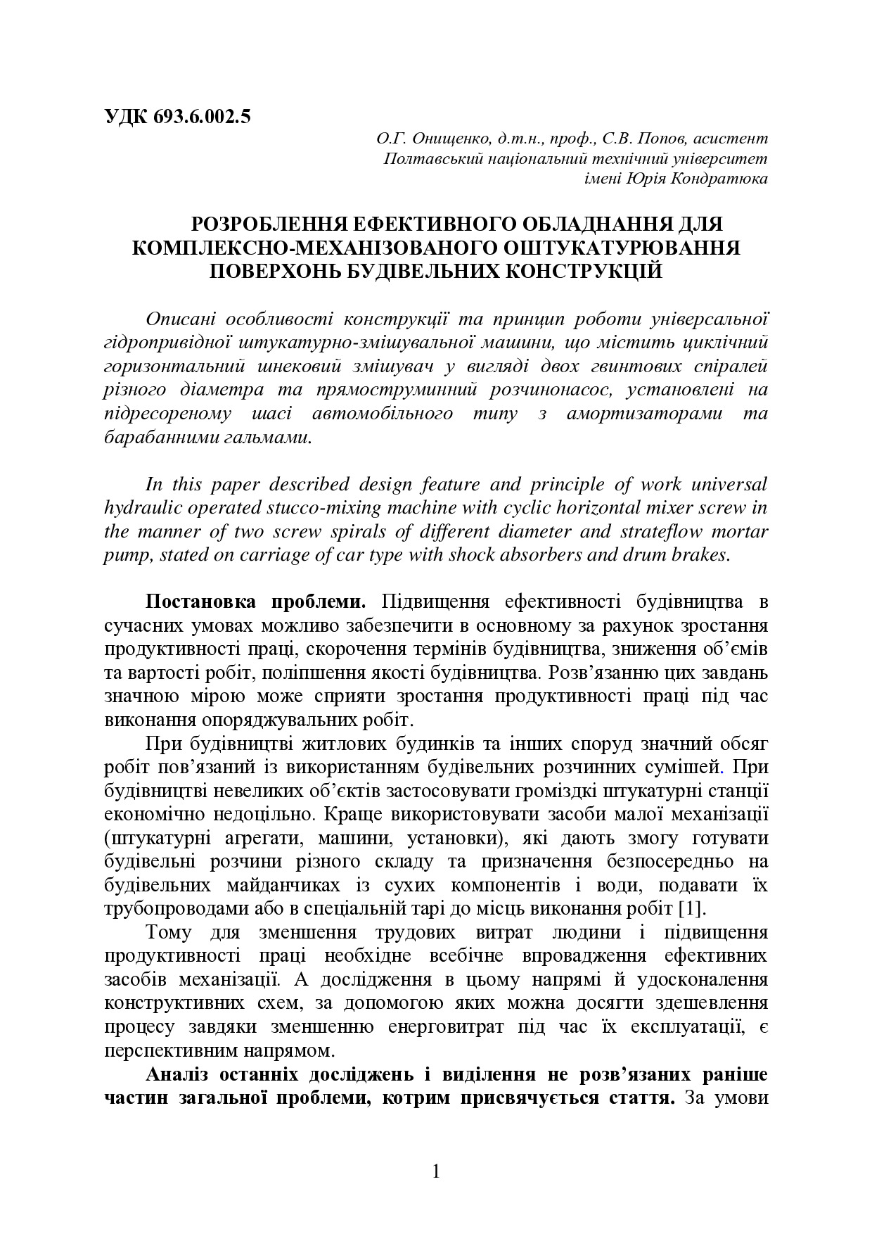 Розроблення ефективного обладнання для комплексно-механізованого оштукатурювання поверхонь будівельних конструкцій