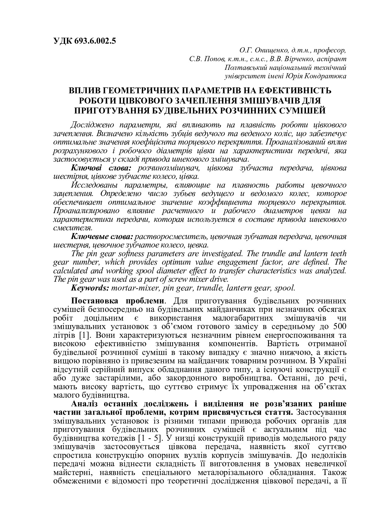 Вплив геометричних параметрів на ефективність роботи цівкового зачеплення змішувачів для приготування будівельних розчинних сумішей