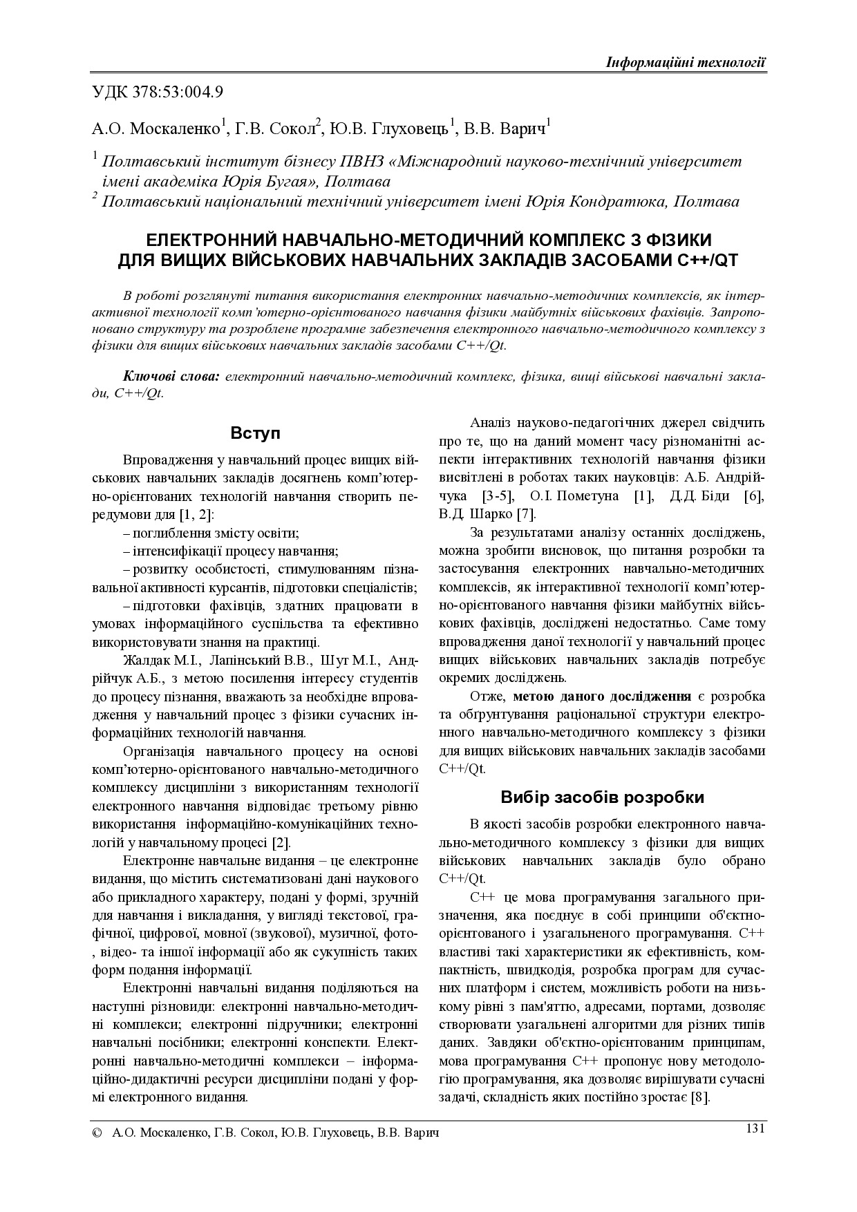 Електронний навчально-методичний комплекс з фізики для вищих військових навчальних закладів засобами C++/QT