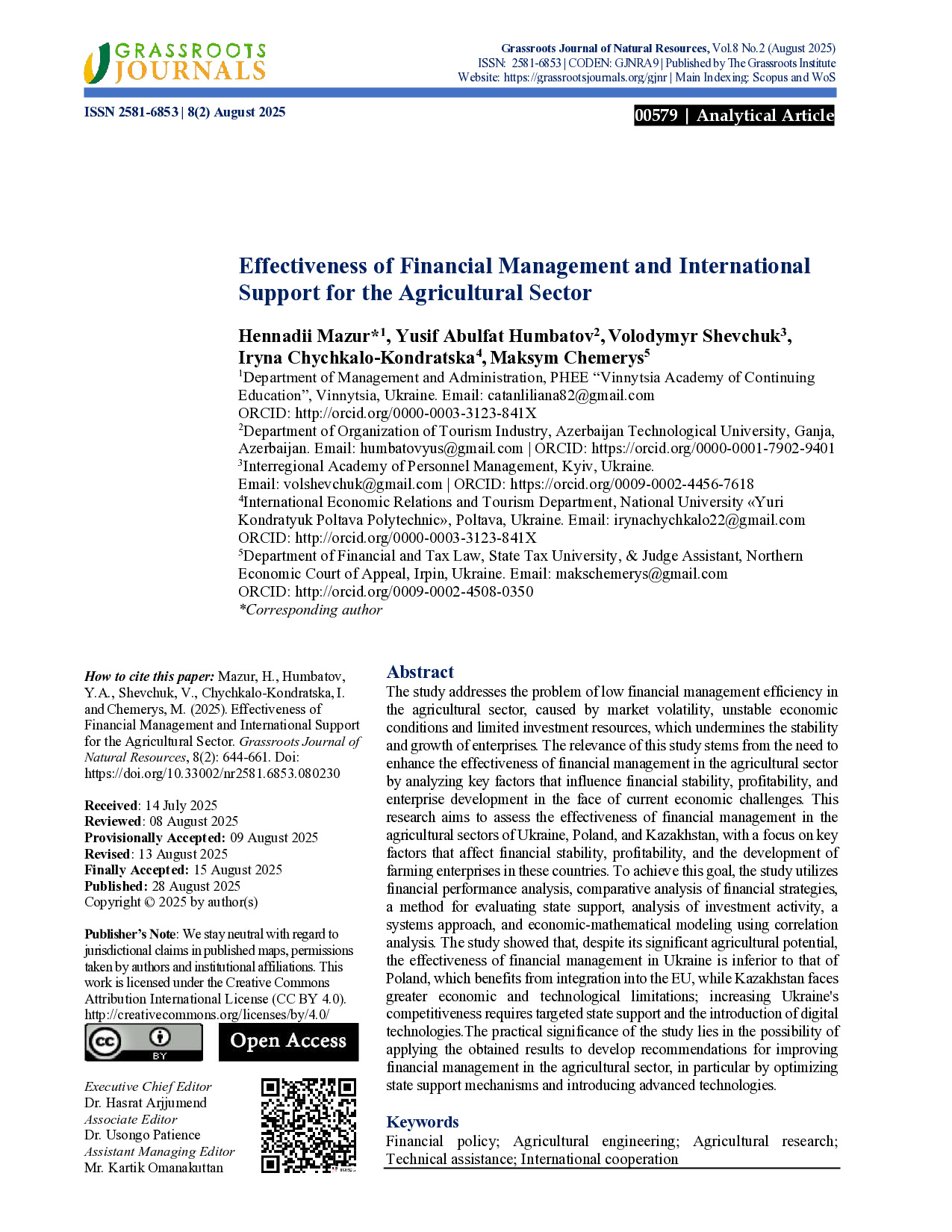 Effectiveness of Financial Management and International Support for the Agricultural Sector / H. Mazur, Y.A. Humbatov, V. Shevchuk, I. Chychkalo-Kondratska, M. Chemerys // Grassroots Journal of Natural Resources. – 2025. – Vol. 8, iss. 2. – P. 644-661. – Doi: https://doi.org/10.33002/nr2581.6853.080230