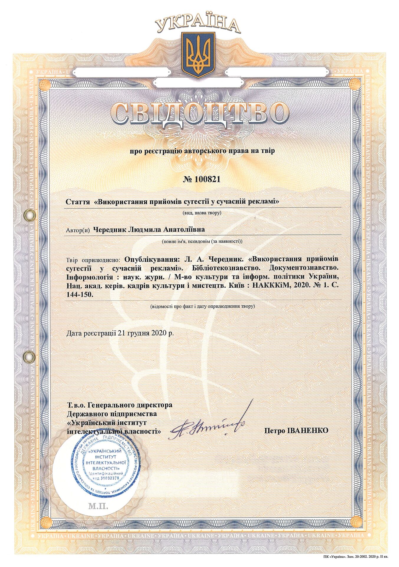Свідоцтво про реєстрацію авторського права № 100821 Україна на твір. Стаття "Використання прийомів сугестії у сучасній рекламі"
