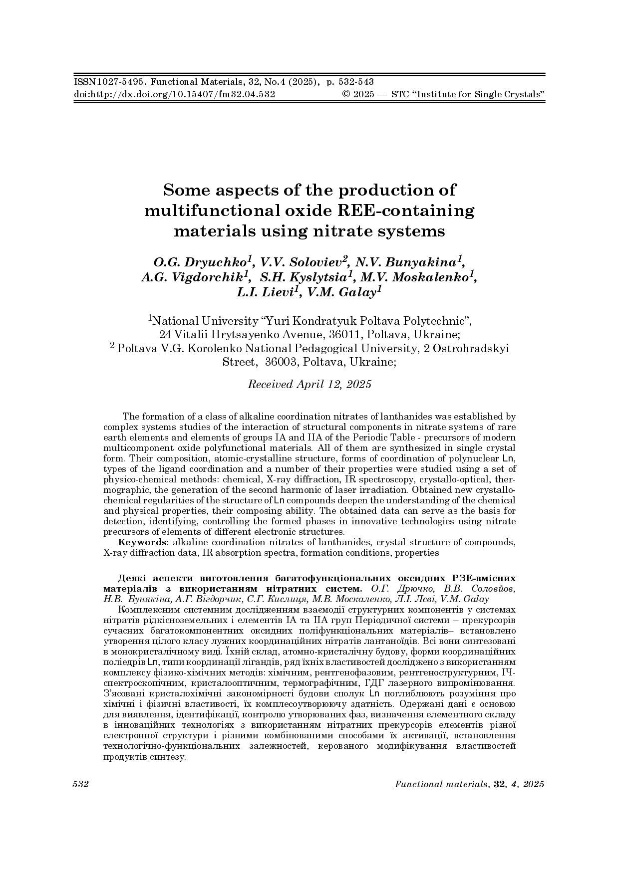 Some aspects of the production of multifunctional oxide REE-containing materials using nitrate systems / O.G. Dryuchko, V.V. Soloviev, N.V. Bunyakina, A.G. Vigdorchik, S.H. Kyslytsia, M.V. Moskalenko, L.I. Lievi, V.M. Galay // Functional Materials. – 2025. – Vol. 32, № 4. – P. 532-543. – DOI:http://dx.doi.org/10.15407/fm32.04.532 (Scopus).