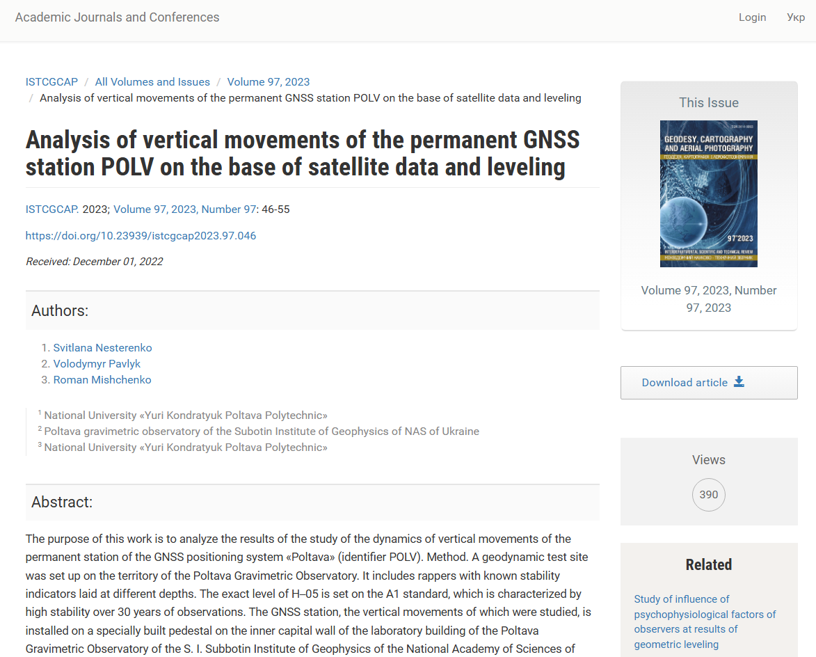Nesterenko S.V. Analysis of vertical movements of the permanent GNSS‒station POLV on the base of satellite data and leveling / S.V. Nesterenko, V.G. Pavlyk, R.А. Mishchenko // Geodesy, cartography and aerial photography : Interdepartmental scientific and technical collection. – 2023. – Vol. 97. – Р. 46–55. – https://doi.org/10.23939/istcgcap2023.97.046