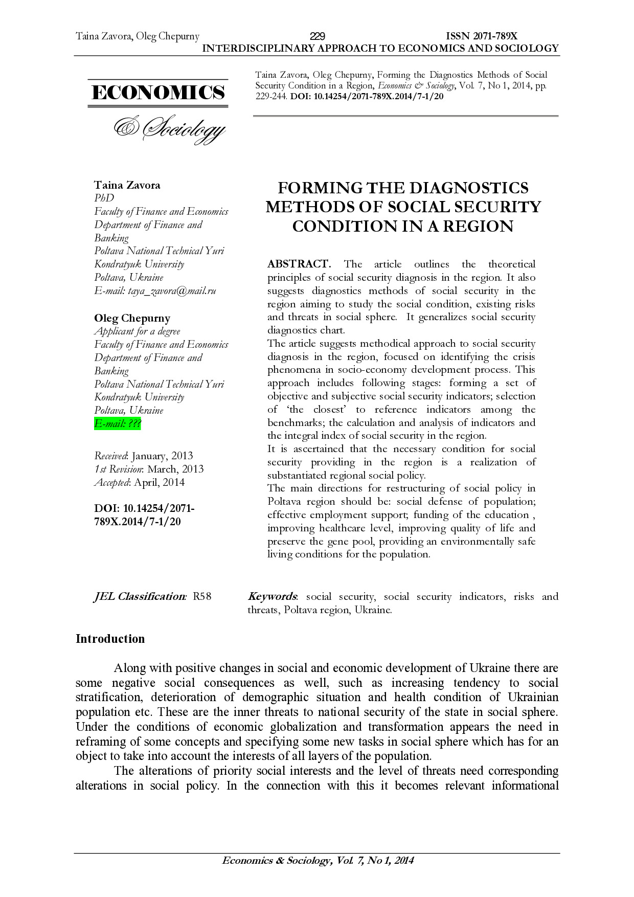 Forming the diagnostics methods of social security condition in region