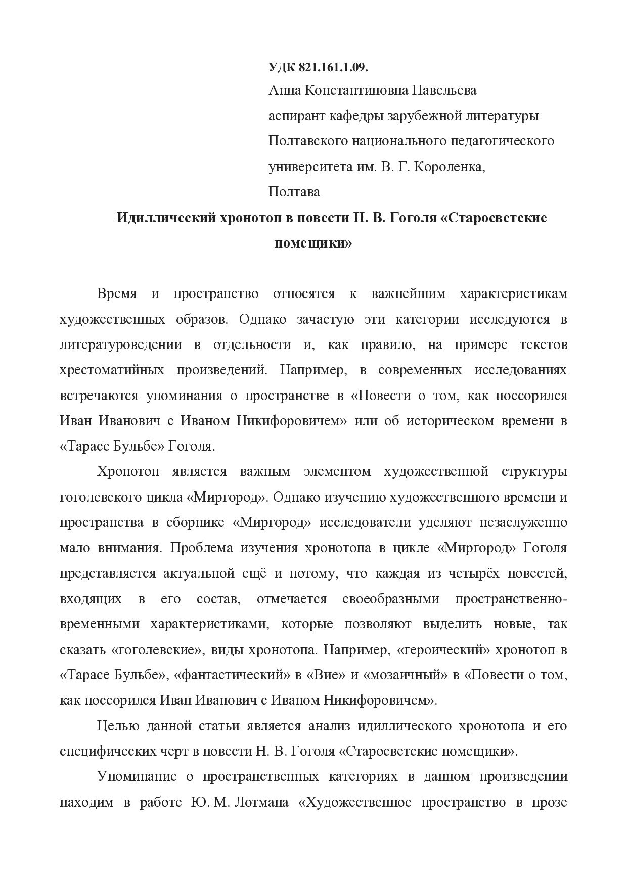 Идиллический хронотоп в повести Н.В. Гоголя «Старосветские помещики»