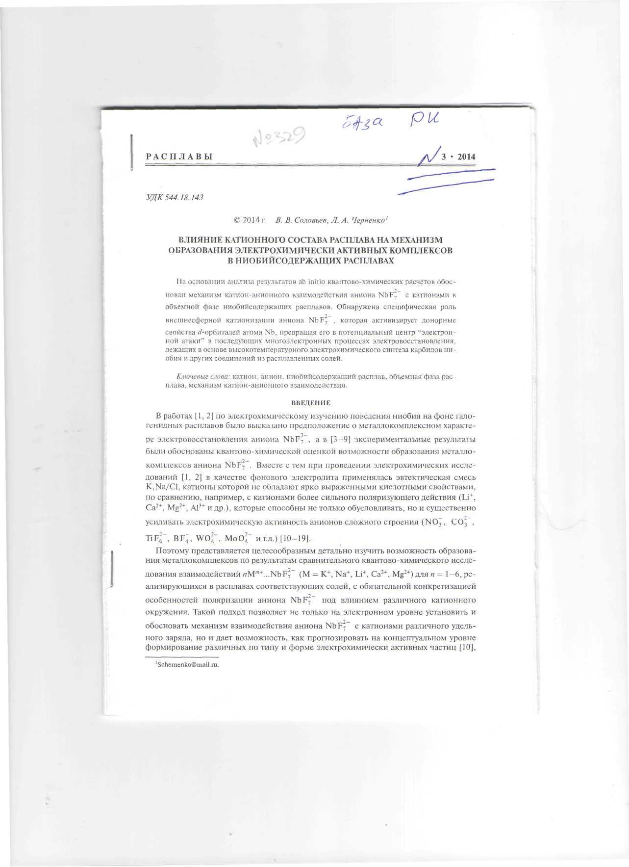Влияние катионного состава расплава на механизм образования электрохимически активных комплексов в ниобийсодержащих расплавах = Вплив катіонного складу розплаву на механізм утворення електрохімічно активних комплексів в ніобійвмісних розплавах