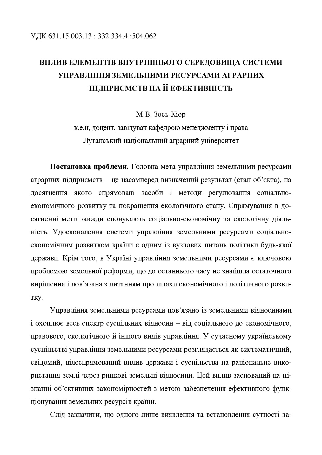 Вплив елементів внутрішнього середовища системи управління земельними ресурсами аграрних підприємств на її ефективність