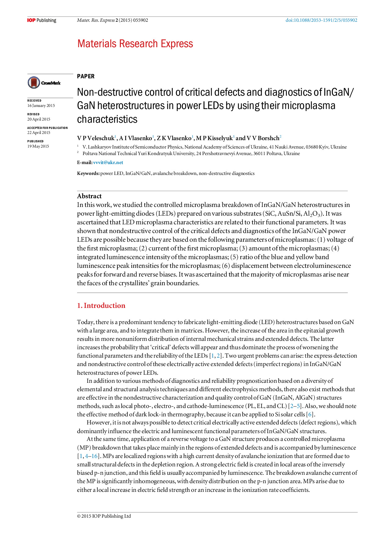 Non-destructive control of critical defects and diagnostics of InGaN/ GaN heterostructures in power LEDs by using their microplasma characteristics