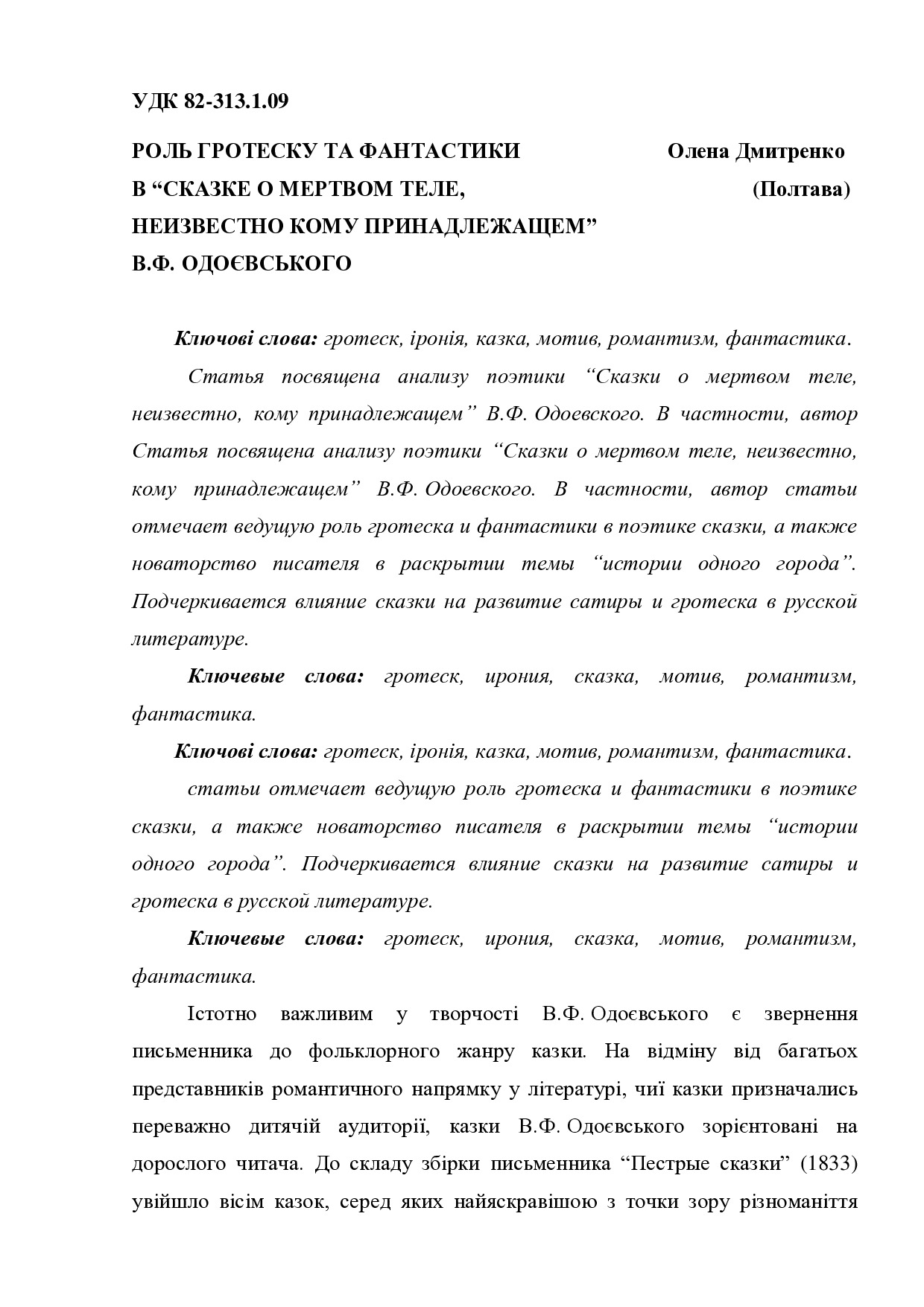 Роль гротеску та фантастики в «Сказке о мертвом теле, неизвестно кому принадлежащем» В.Ф. Одоєвського