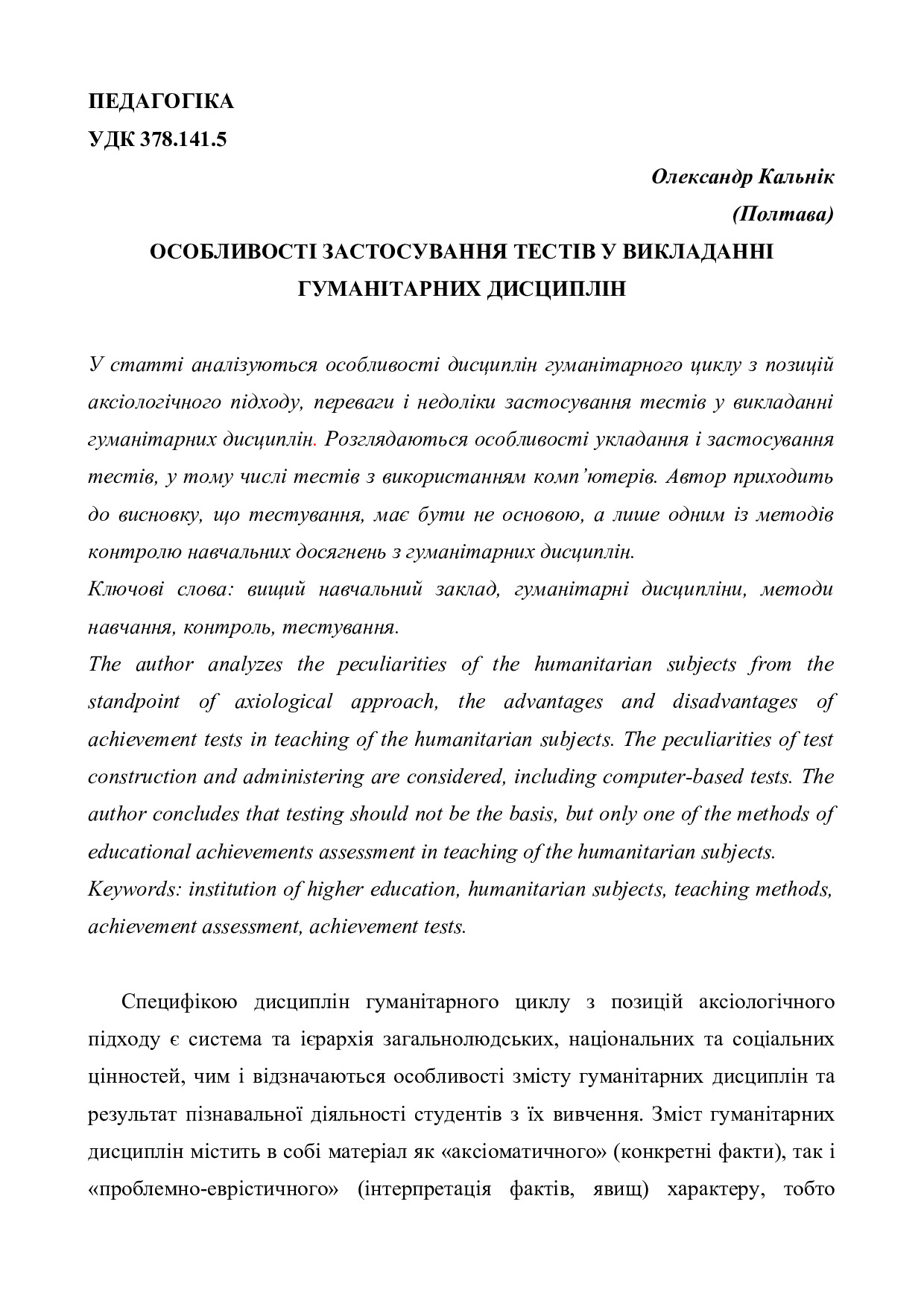 Особливості застосування тестів у викладанні гуманітарних дисциплін