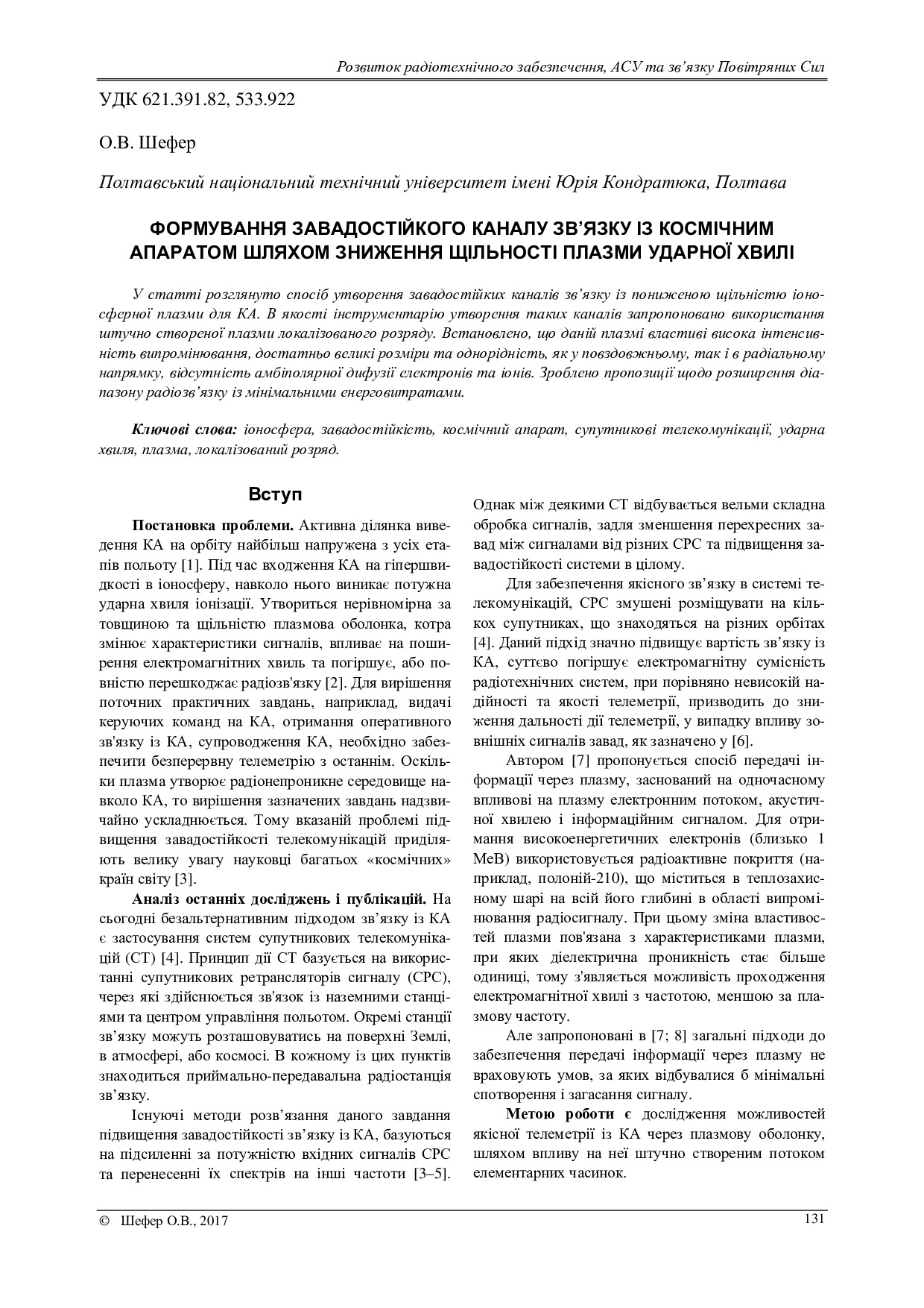 Формування завадостійкого каналу зв’язку із космічним апаратом шляхом зниження щільності плазми ударної хвилі