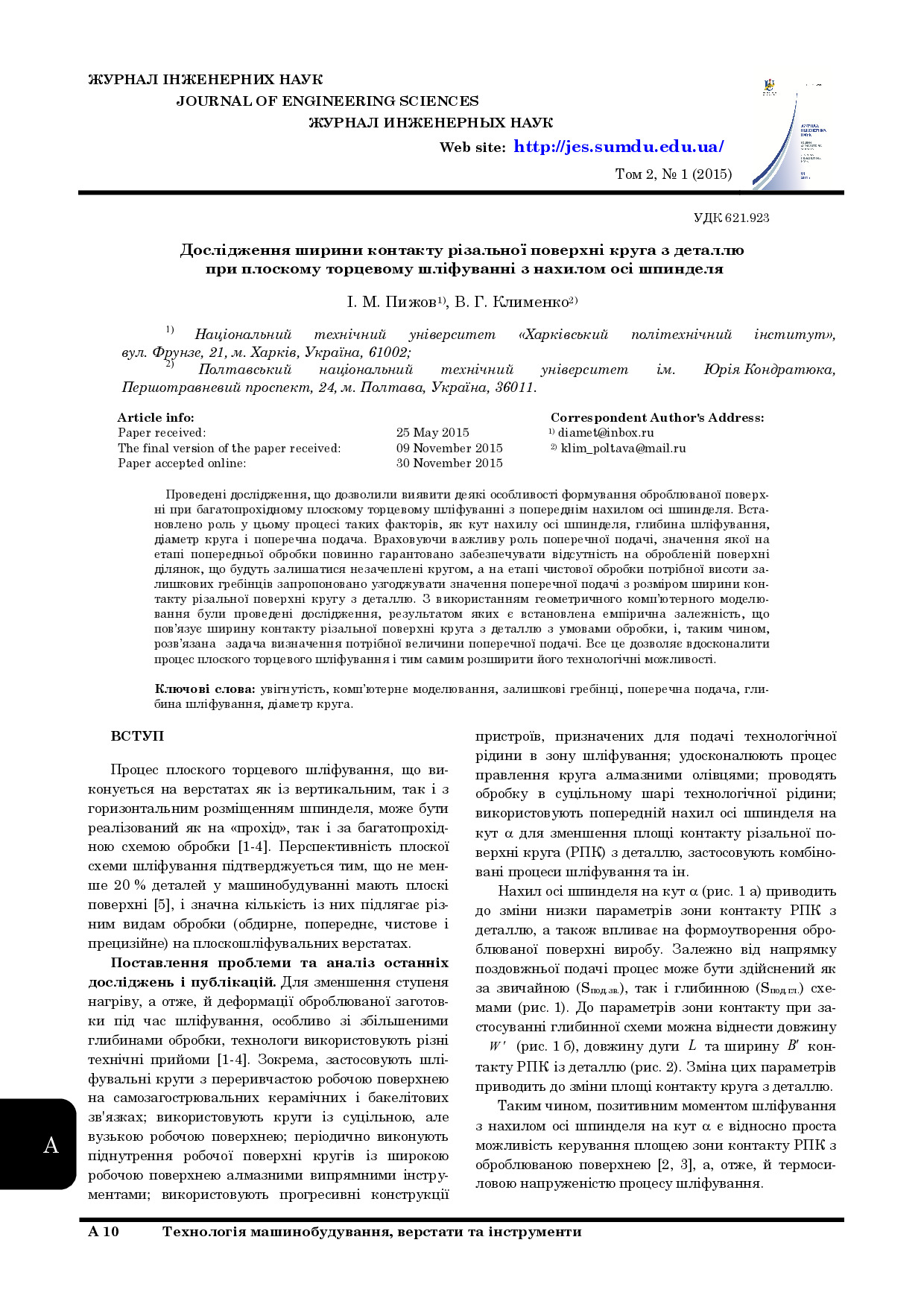 Дослідження ширини контакту різальної поверхні круга з деталлю при плоскому торцевому шліфуванні з нахилом осі шпинделя