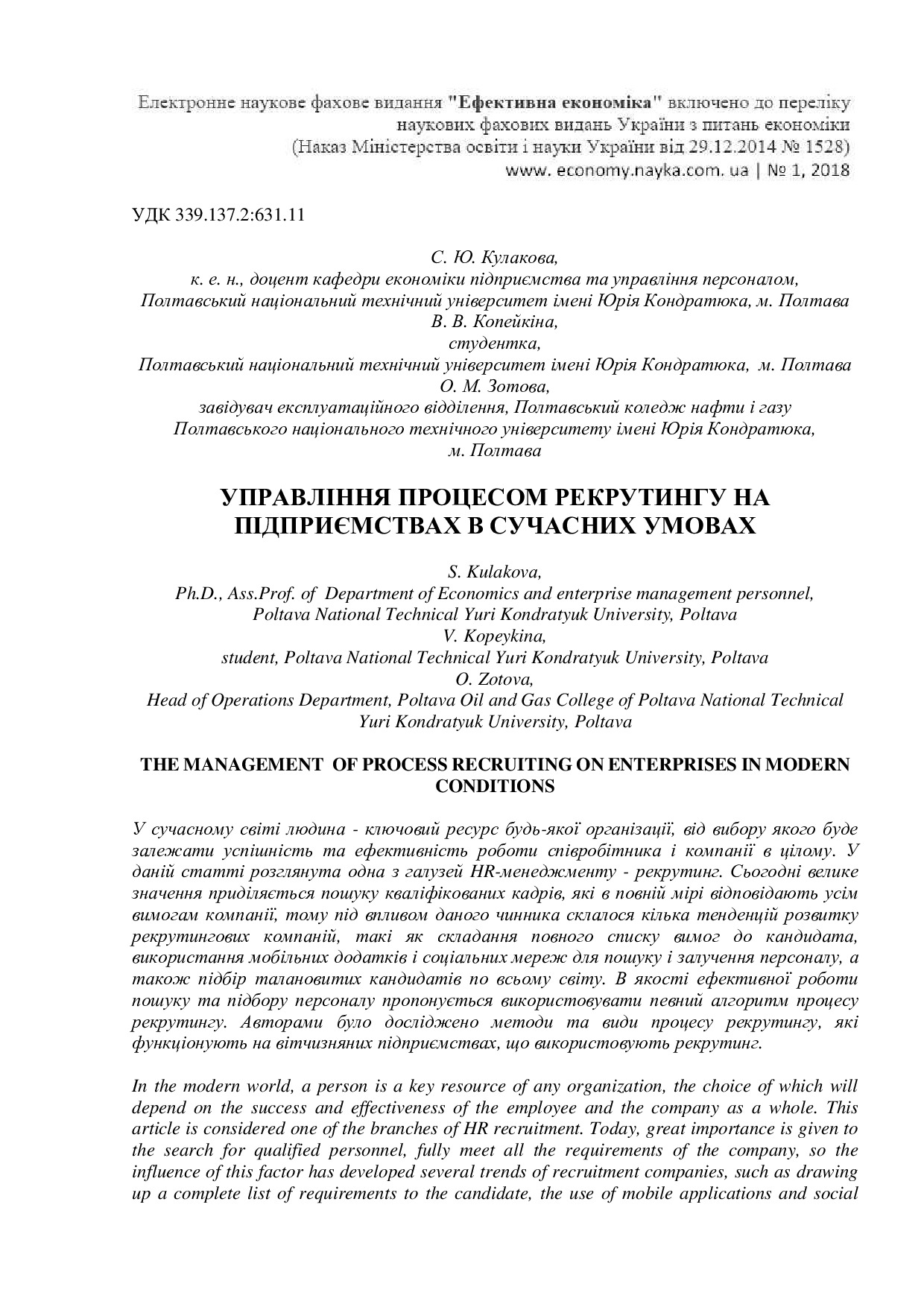 Управління процесом рекрутингу на підприємствах в сучасних умовах