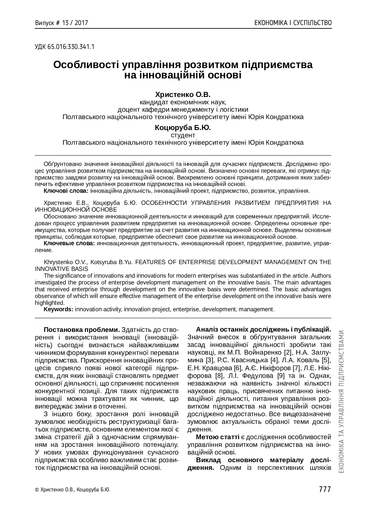 Особливості управління розвитком підприємства на інноваційній основі
