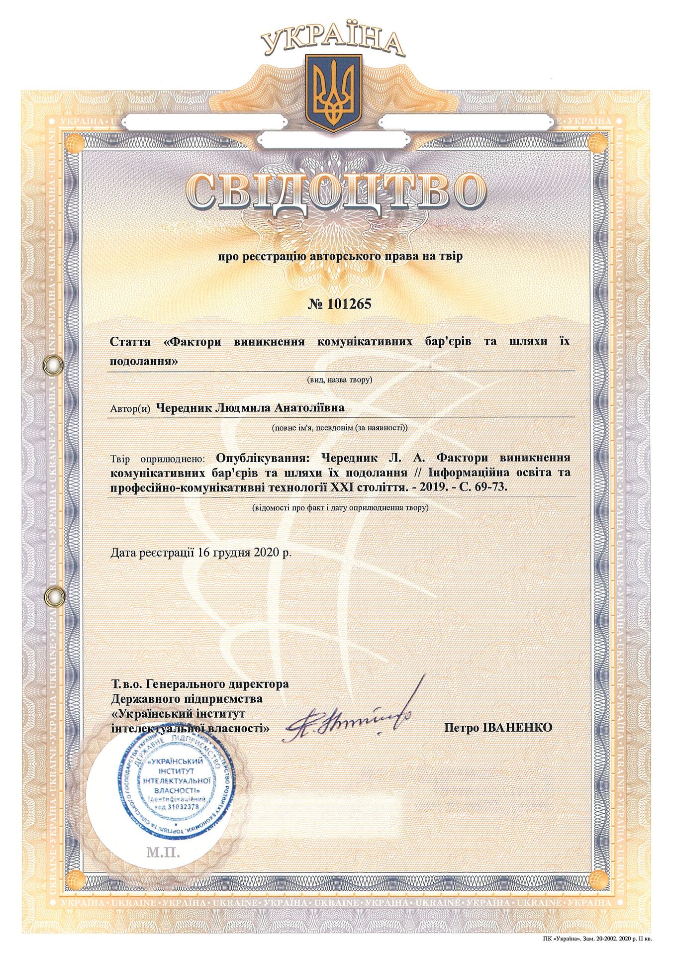 Свідоцтво про реєстрацію авторського права № 101265 Україна на твір "Фактори виникнення комунікативних бар'єрів та шляхи їх подолання"