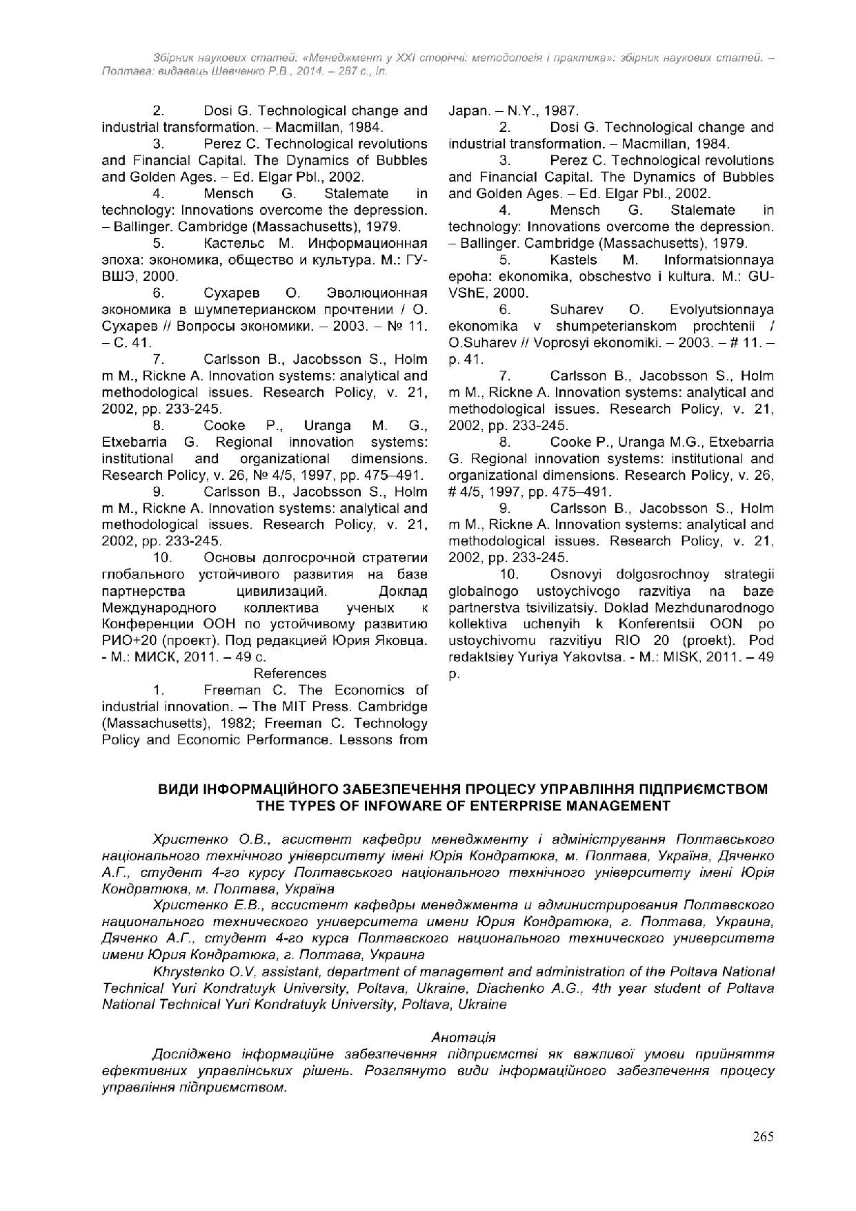 Христенко О.В. Види інформаційного забезпечення процесу управління підприємством / О.В. Христенко // Менеджмент у ХХІ сторіччі: методологія і практика : зб. наук. ст. – Полтава : Шевченко Р. В., 2014. – С. 265–270.