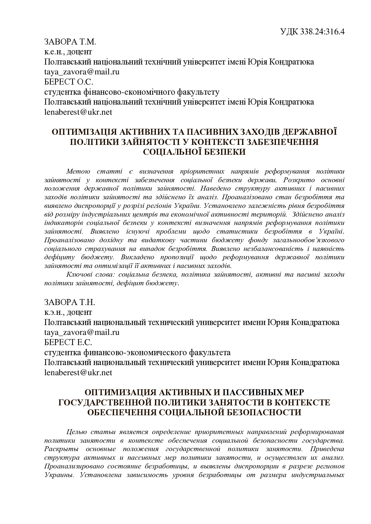 Оптимізація активних і пасивних заходів державної політики зайнятості у контексті формування соціальної безпеки