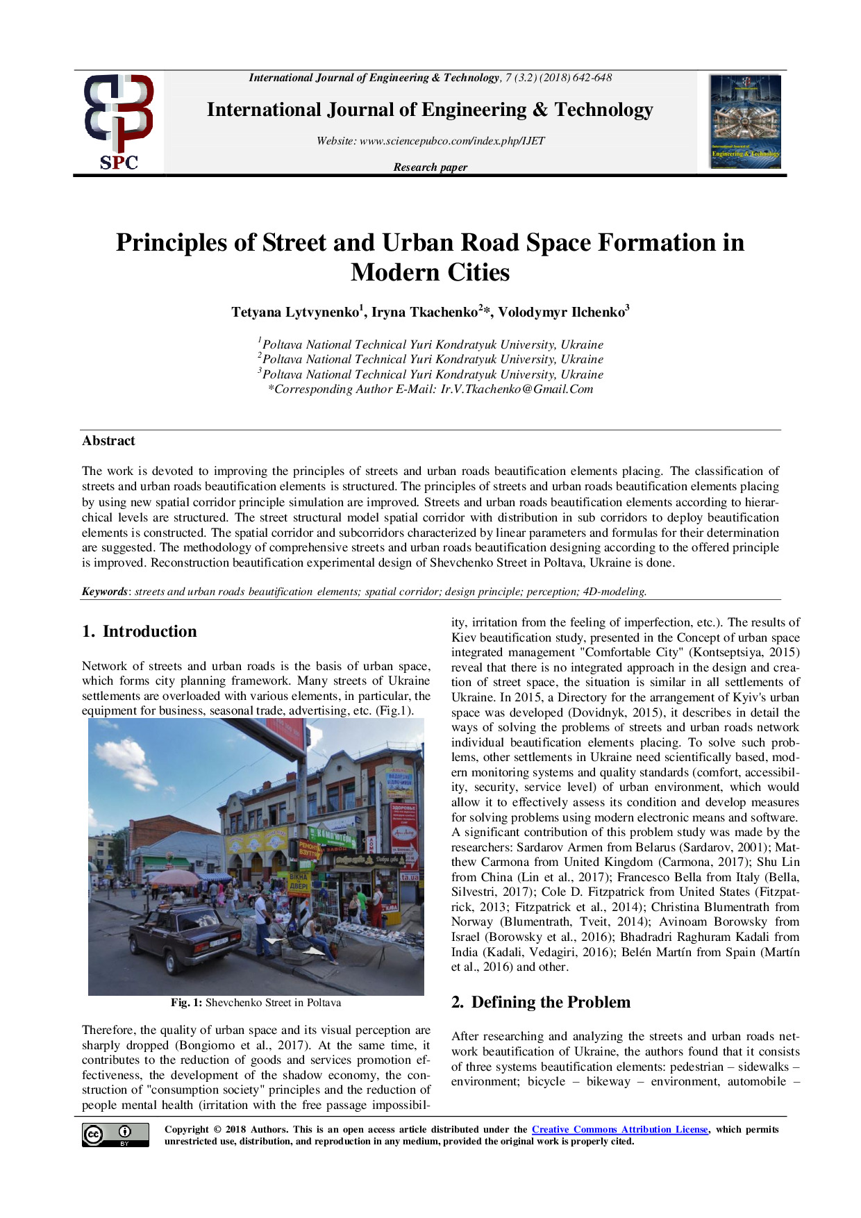 Lytvynenko T.P. Principles of Street and Urban Road Space Formation in Modern Cities / T.P. Lytvynenko, I.V. Tkachenko, V.V. Ilchenko // International Journal of Engineering & Technology. - 2018. - Iss. 7(3.2). - P. 642-648. - DOI: 10.14419/ijet.v7i3.2.14606/. - URL : https://www.sciencepubco.com/index.php/ijet/article/view/14606