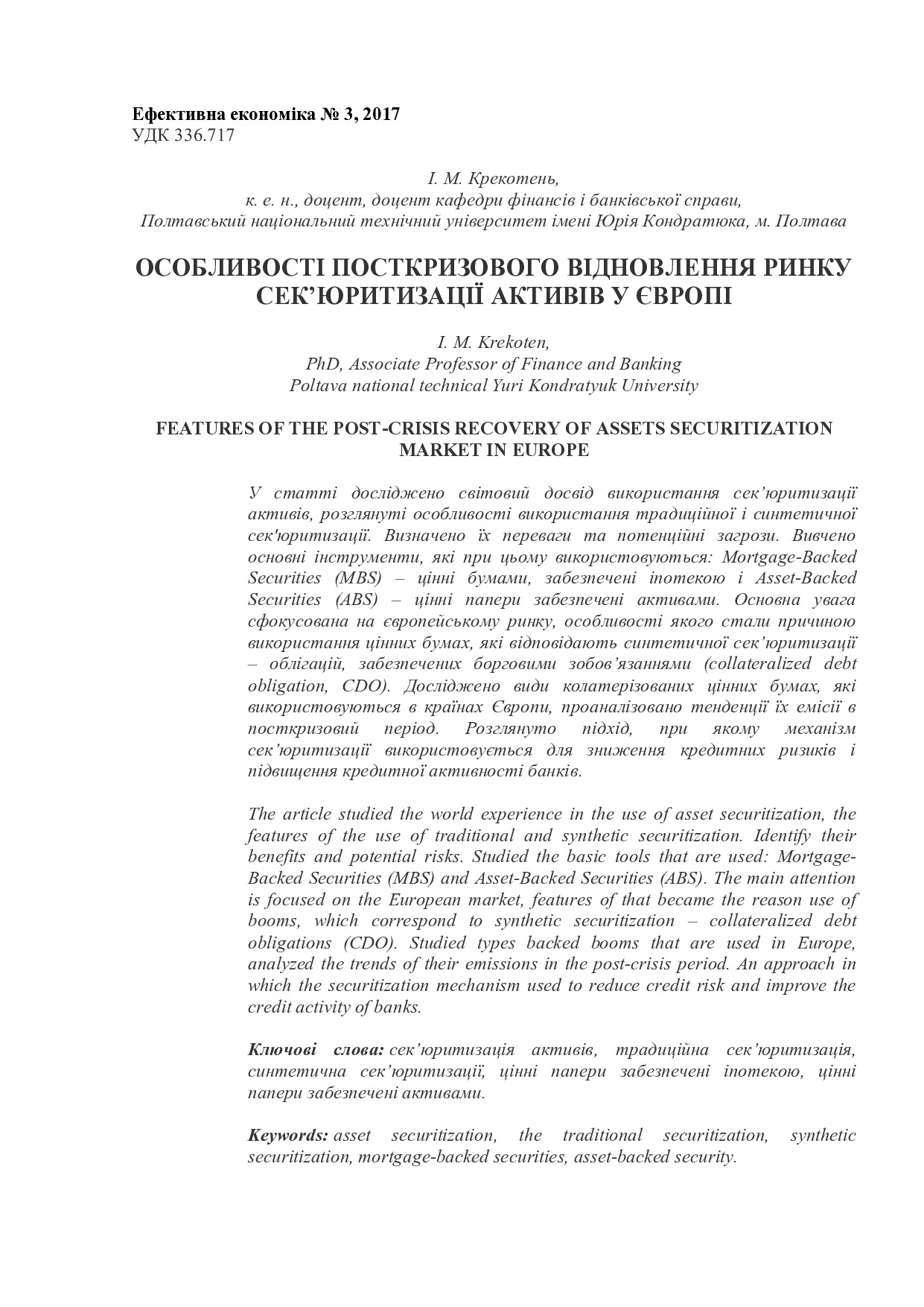 Особливості посткризового відновлення ринку сек’юритизації активів у Європі