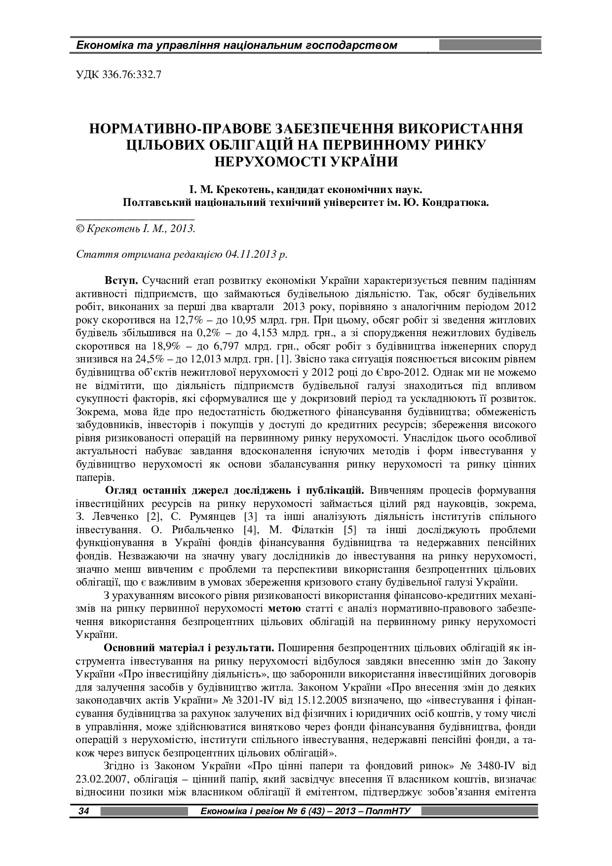 Нормативно-правовое обеспечение использования целевых облигаций на первичном рынке недвижимости Украины