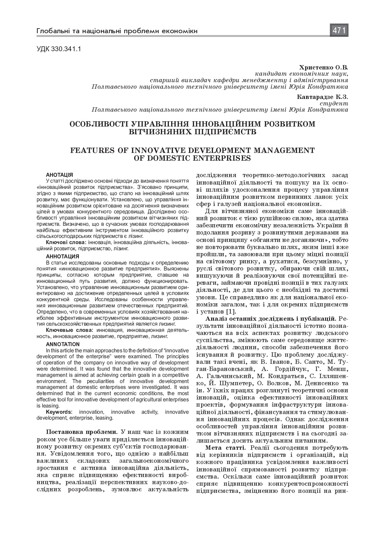 Особливості управління інноваційним розвитком відчизняних підприємств